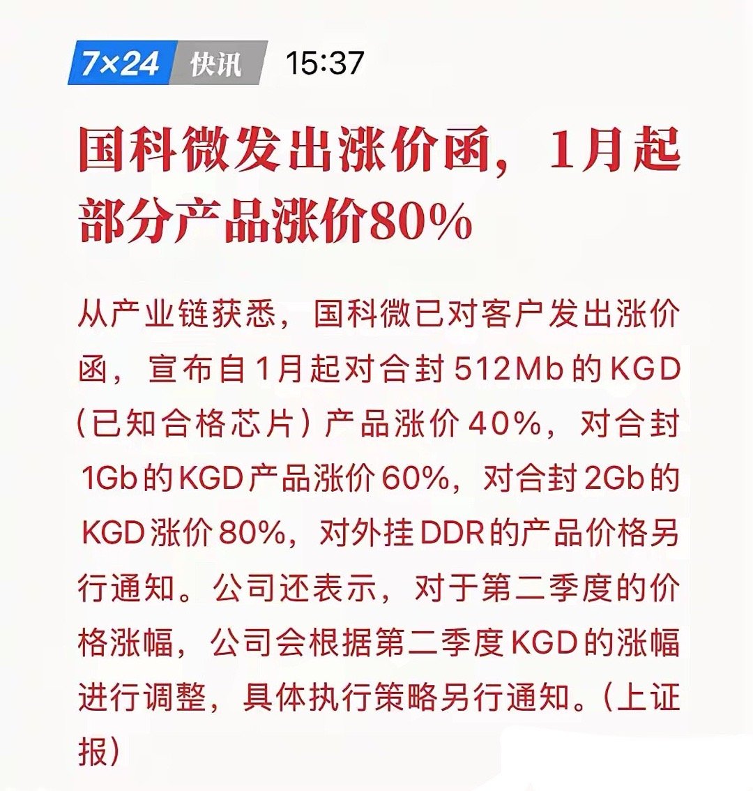 炸了!国产芯片一夜暴涨80%,国科微发“限供令”,下游厂商集体失眠!刚刚,国科微一纸涨价函震动整个电子圈:2Gb合封KGD芯片,1月起直接涨价80%!二季度还要涨——看涨不看跌。别小看这颗小芯片,KGD(已知良裸晶)是高端手机、AI模组、智能汽车的记忆心脏。国科微作为国内极少数能稳定供货的厂商,这一大刀,直接砍向整个硬件产业链。为什么敢这么涨?全球先进封装产能告急;英伟达、华为带动AI终端爆发,存储需求井喷;国产替代从能用进入抢着用阶段。业内透露:订单已排到6月,部分客户被要求先打款、再排队,小厂直接被踢出供应名单。这背后,是中国芯第一次用稀缺性定价,而不是用低价换市场。风暴已起,无人能躲,国产崛起,从来不是免费的!