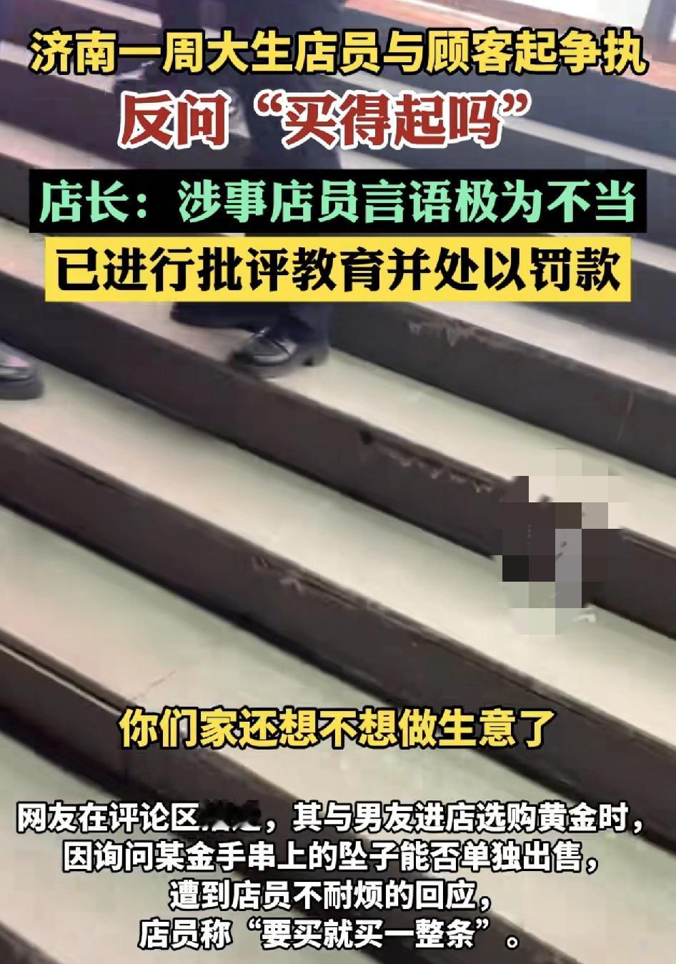 济南一家周大生门店与顾客发生争执。但是顾客与男朋友一起在挑选金首饰,问店员项链上的吊坠是否可以单独买时,店员不耐烦的回答,要买就买一条。当顾客质疑对方的服务态度时,却被怼“买得起吗”。目前涉事员工已被店家批评教育,认为是自己员工态度的问题。