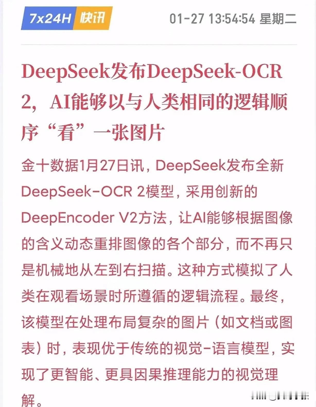 DeepSeek-OCR 2这次更新特别厉害,但这只是个开始。以前AI可能只能“认字看图”,现在它能像人一样琢磨事、懂逻辑了。 机器看东西也不只是“能看见”,是真的“明白”里面是什么意思。 咱们正在进入一个全新的智能时代——不是机器跟人抢饭碗,而是人和机器搭伙干活儿,一起搞出更多有用的东西来! 蹲守DeepSeek 概念股的朋友们明天应该有福了!