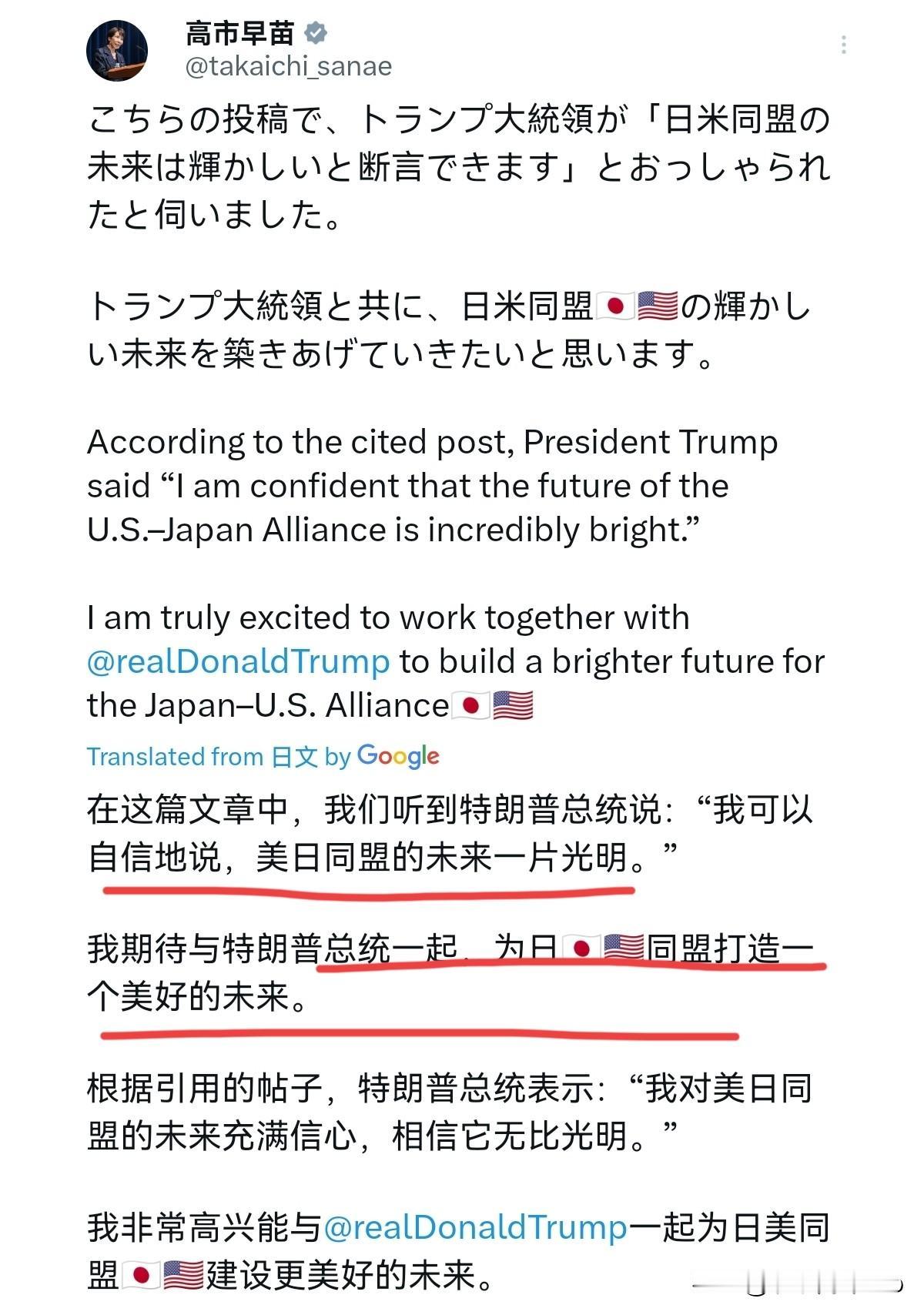 果然是在打算盘!高市早苗再次挑衅我们之后,第一时间就紧抱美国的大腿!1月27日,高市早苗公开喊话美国称,特朗普总统表示:我坚信,美日同盟的未来前景无限光明。我由衷期待与特朗普总统携手,共创美日同盟的美好未来。很显然,高市早苗刚声称发生严重事态时,必须去救在台湾的日本人和美国人。美军受到攻击时,如果日本什么都不做就逃回去,日美同盟会崩溃。 其再次在台湾问题上对我们挑衅之后,高市早苗第一时间就抱紧了美国的大腿。高市早苗这一姿态传递的信息是什么呢?显然,对内而言,高市早苗的算盘就是借此告诉日本国内各界,美日关系很高,日本与美国是共同进退的。即便现在中日关系恶化,日本国内也无需就此担心。高市早苗无疑是借势美国,以安定日本国内民众之心,为其暴冲行径进行掩护。 对外而言,高市早苗这是积极对美国示好,以高度配合美国遏华的姿态,要换取美国对日本的松绑。因此,高市早苗前脚对我们挑衅,后脚对美国示好,这说明其早就盘算好了,那就是以恶化对华关系为代价,裹挟,塑造有利于整军备武的氛围,走军国主义道路。很显然,面对这样的高市早苗,恐怕我们还要下重手,彻底断了其念头。