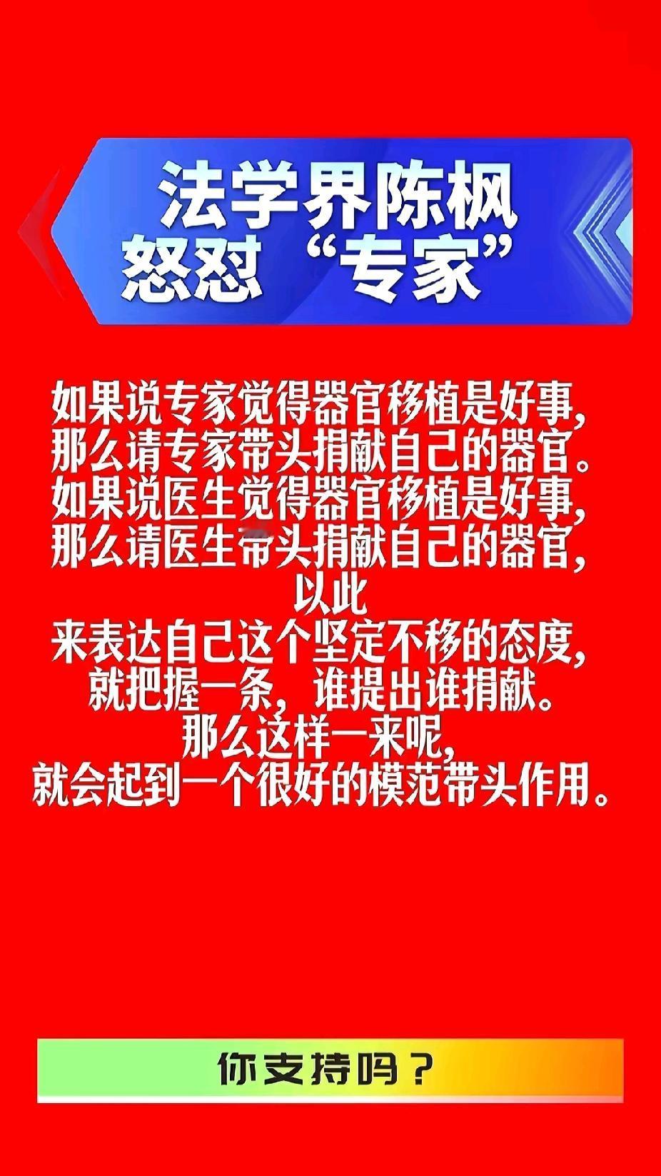 法学界陈枫直接怒怼专家:要是觉得器官移植是好事,专家就该带头捐器官,谁提出来谁先上,这话听着糙,却把那些站着说话不腰疼的人给怼哑了。 这话听着极端,却精准戳中了很多人的情绪。现在不少专家总在台上大谈各种“好事”,但这些事一旦要落到实处,要普通人去承担风险和成本时,他们自己却总是隐身。 陈枫敢这么硬刚,绝非一时兴起,作为深耕公共政策伦理的法学人士,他盯着的是“倡议者缺位”的关键问题。2024年5月1日起施行的《人体器官捐献和移植条例》明确强调“自愿、无偿”,还要求加强宣传引导和流程透明化,可有些专家光拿着条例喊口号,自己连最基本的志愿登记都回避。 要知道我国器官移植改革有多不容易,黄洁夫牵头推动2015年全面停用死囚器官,打破了过去的权宜之计,这才建立起公民自愿捐献的合法体系。到2025年底,全国志愿登记人数超728万,90%是45岁以下年轻人,可等待移植的患者仍超18万,每年实际手术量才2.4万多例,供需矛盾确实存在。 但矛盾的核心从不是普通人不够“奉献”,而是专家们的示范作用没跟上。条例都规定了要“培育有利于器官捐献的社会风尚”,可那些天天呼吁别人捐献的专家,有几个像普通志愿者那样,主动登记并告知家人?要知道生前登记过的志愿者,家属后续同意捐献的概率会大幅提升,专家们连这点实际行动都不肯做。 更让人不舒服的是,有些专家还传播不实信息,早年讹传的“供需比1∶150”就是例子,黄洁夫早就澄清过,实际符合移植指征且有条件手术的患者约3万人,真正制约行业发展的是医疗资源不均和保障不足,不是普通人的捐献意愿。 陈枫的怒怼本质是替公众要“公平”,器官捐献是大爱善行,可不能只让普通人当主角。新条例都要求“定期公布捐献和分配情况”,接受社会监督,专家们与其指责公众观念落后,不如先带头遵守条例精神,主动登记、公开透明,用行动消除大家对流程不透明的顾虑。 年轻人已经用728万的登记量证明了对新观念的接受度,现在该轮到专家们跟上了。真要推动这项事业,不是靠嘴说,而是靠实打实的示范,你自己都不敢迈出第一步,凭什么要求别人冒着误解和风险去奉献? 各位读者你们怎么看?欢迎在评论区讨论。