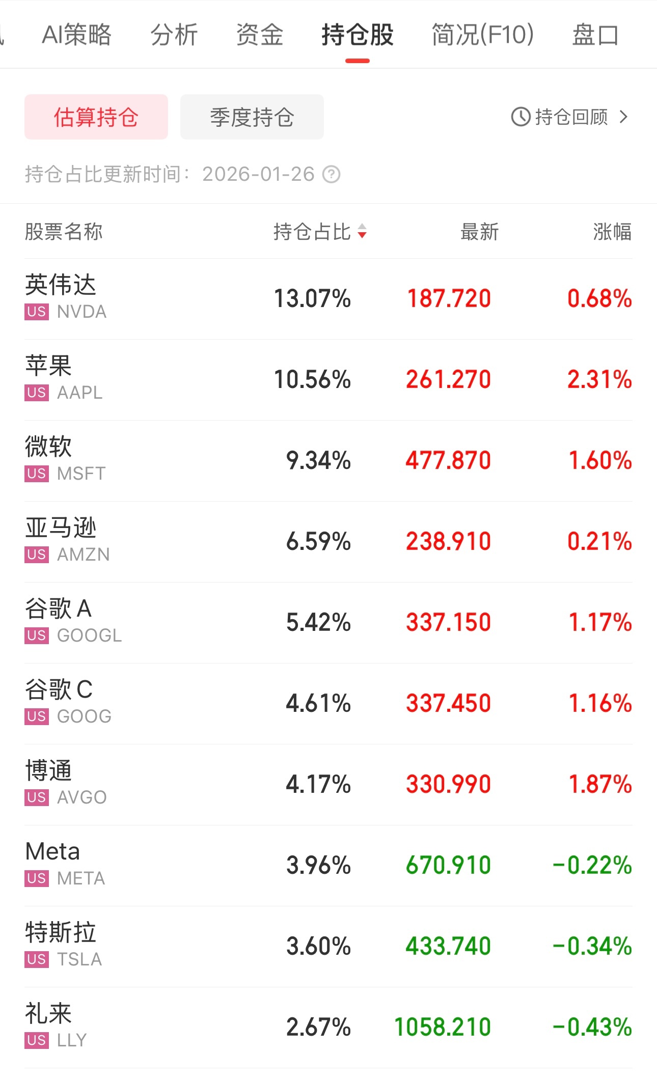 未来我要更重视基金,后面券商赚钱了,得及时换到基金。图一这只基金,相当于持有13.07%的英伟达,10.56%的苹果,10.03%的谷歌,9.34%的微软,6.59%的亚马逊,这五家公司合计占比49.59%。图二只基金,相当于持有19.61%的英伟达,17.38%的苹果,15.55%的微软。三只股票占比52.54%。