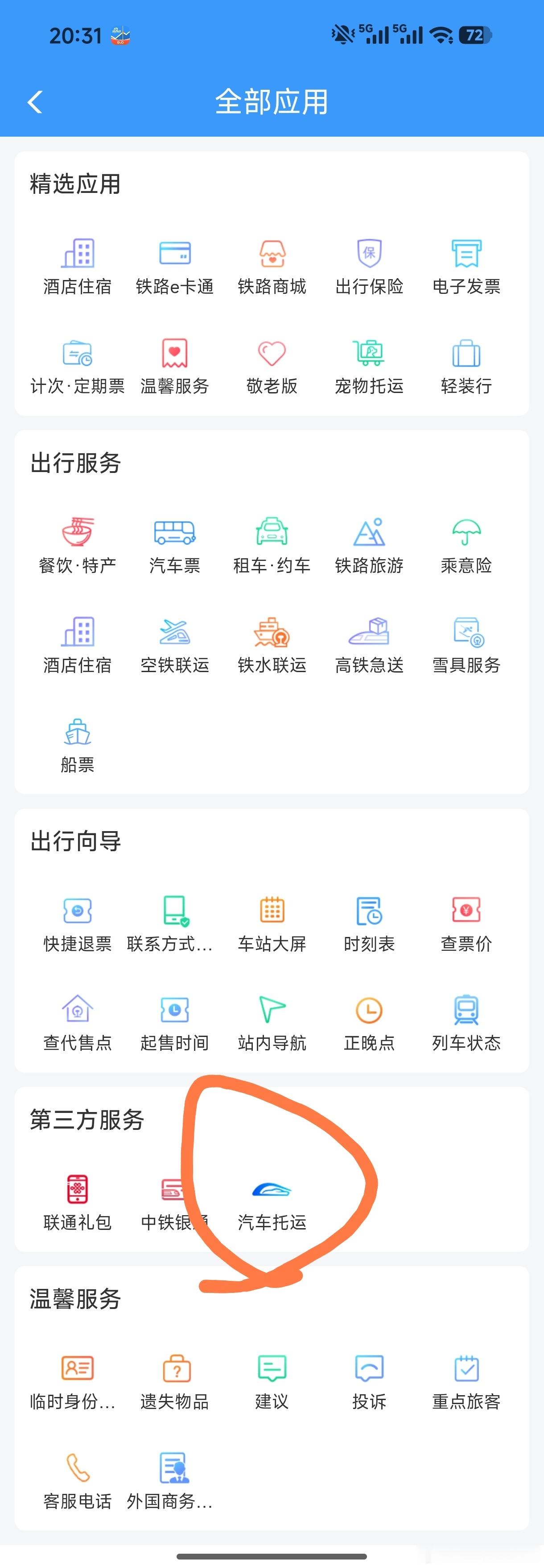 12306托运汽车订单火爆这个业务可太好了以前我都是提前一周把车给物流公司拖过去例如去北京,大约需要开11h,太累了,所以我会花950拖过去办理方法:打开铁路12306 App→我的→应用→全部应用→第三方服务→汽车托运,跳转至 国铁汽车托运 小程序可惜还没有固定的 长春-北京路线
