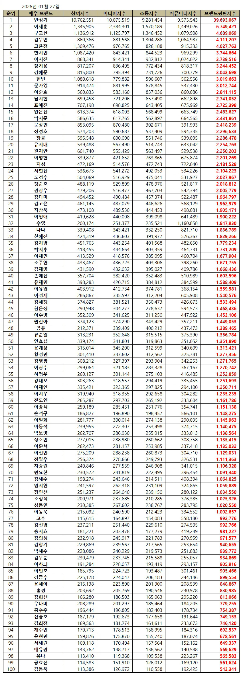 2026年1月演员(电视剧、电影、OTT)品牌评价Top301-10名:安圣基、李帝勋、具教焕、金宇彬、高允真、韩志旼、李瑞镇、张基龙、金慧埈、玄彬1-20名:文佳煐、李俊昊、南志铉、表艺珍、安恩真、朴叙俊、文相敏、郑敬淏、张栗、刘智泰21-30名:元志安、李秉宪、池晟、徐玄振、都暻秀、郑俊浩、权相佑、金多美、金高银、池昌旭