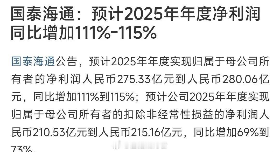 券商板块终于迎来重磅利好!国泰君安与海通证券合并后的2025年业绩报告正式披露,扣非净利润同比增长69%-73%,这一增速远超此前机构预期。合并前,市场对原国泰君安与海通证券2025年合并净利润的一致预期多在200-230亿元区间,而此次业绩预告中枢约277.7亿元,超出预期20%以上,业绩提升幅度显著。近期券商板块表现相对萎靡,资金认可度不高,此次超预期的业绩报告有望缓解板块的调整压力。更关键的是,合并后业绩超预期20%,不仅印证了券商合并模式的可行性,更让市场对后续更多券商启动合并重组充满期待,为板块注入新的想象空间。