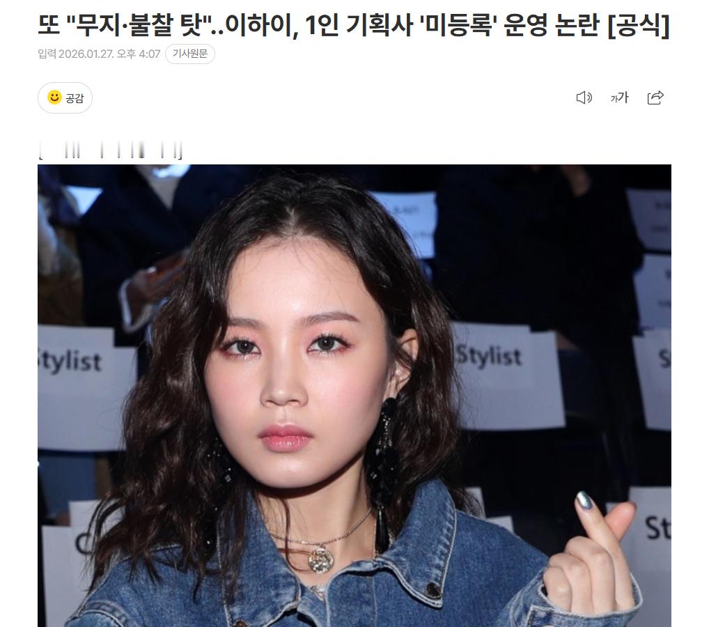 【韩国歌手李遐怡个人经纪公司被曝无证经营5年,发文称“为自己的无知道歉”】海外新鲜事热点现场 歌手李遐怡设立的个人经纪公司被曝已无证经营超过5年。李遐怡所属公司duover方面27日对Star News表示:"由于李遐怡一直与本公司签订专属合约进行活动,因此在此过程中未能认识到个人经营者需要另行办理大众文化艺术策划业务注册","为此我们在事后补修了相关教育课程,并于最近完成了注册手续。"接着表示:"这是公司和艺人双方因无知和疏忽导致的事件。对此给大家带来的困扰,我们深表歉意。今后我们将更加彻底地确认相关法规和程序,慎重开展活动,避免类似事件再次发生。"此前当天有媒体报道称,李遐怡于2020年设立的个人经纪公司808 HI Recordings未向管辖机构注册,一直处于非法运营状态。据报道,李遐怡的个人经纪公司已于本月21日在所属管辖的麻浦区政府完成了大众文化艺术策划业务的注册。文化体育观光部为了整顿行业内普遍存在的无证经纪公司问题,将去年年底之前定为"集中注册指导期"。但有消息称,李遐怡的公司是在该期限结束三周后才办理了注册手续。现行《大众文化艺术产业发展法》规定,从事演艺经纪等大众文化艺术策划业务的法人或超过一人的个体经营者,若未在地方政府注册而开展业务,可处以2年以下有期徒刑或2000万韩元以下罚款。