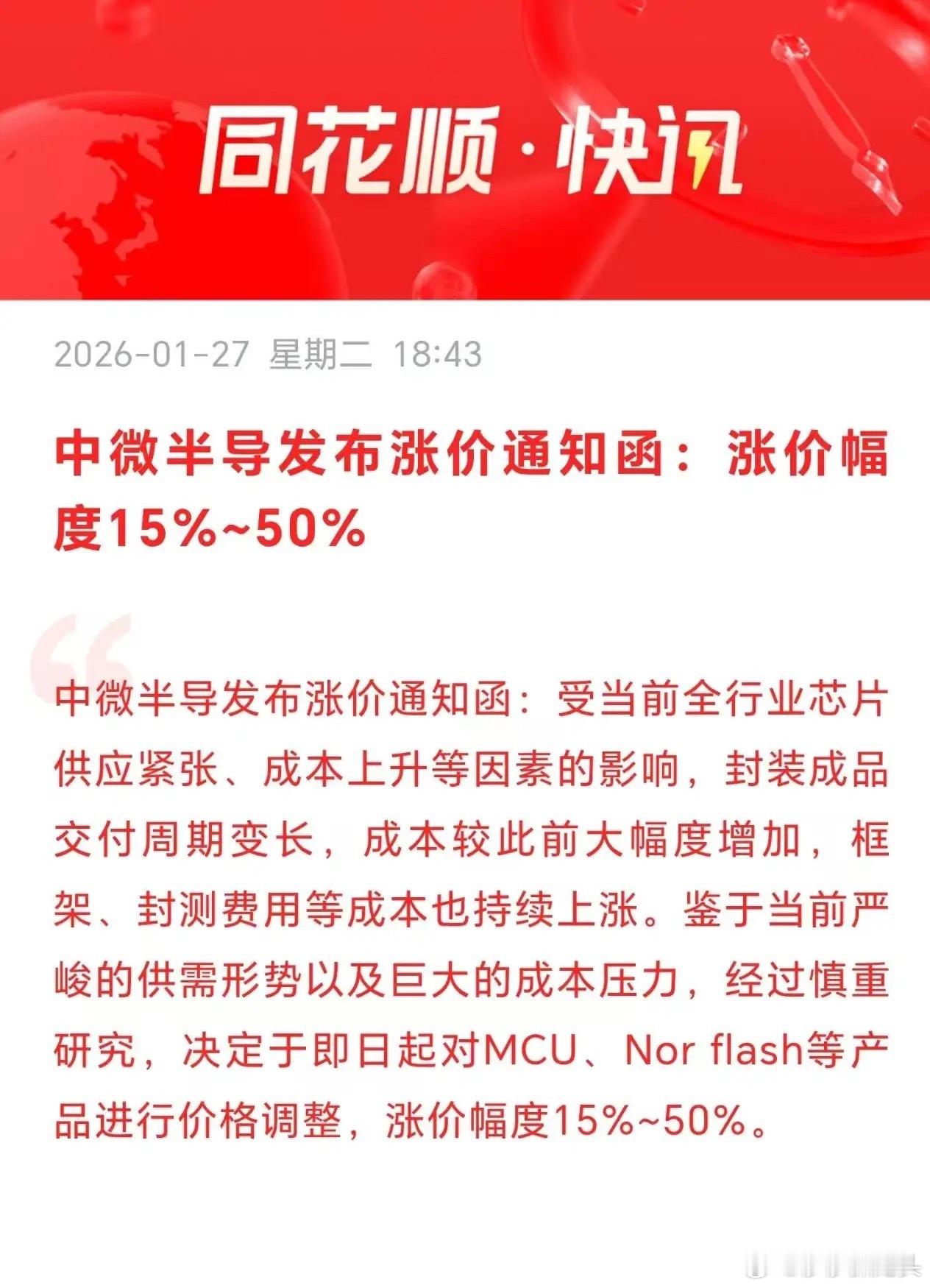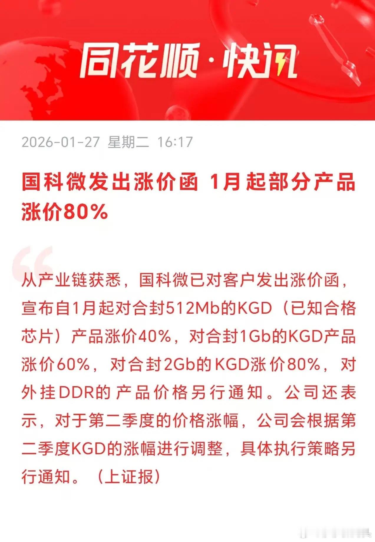 半导体大利好,明天有望延续涨势吗?刚刚盘后两个半导体公司齐刷刷发布大幅涨价的通知,其中国科微宣布自1月起对合封512Mb的KGD(已知合格芯片)产品涨价40%,对合封1Gb的KGD产品涨价60%,对合封2Gb的KGD涨价80%。另外,中微半导也发布涨价通知函,决定于即日起对MCU、Norflash等产品进行价格调整,涨价幅度15%~50%。大家看这个涨价通知,是不是对于半导体板块而言是一个大利好?两家半导体公司不约而同的发布涨价通知,而且涨幅还不小,这说明了什么?我想这直接宣示了当前半导体产业链高景气度的现状,特别是存储半导体这一块更是迎来了史无前例的超级周期。今天大A半导体板块带队反攻,从而顺势带动大盘走强。这也说明了当前的人气所在。随着盘后这两家半导体公司发布涨价的通知,我想明天半导体大概率有望延续涨势。