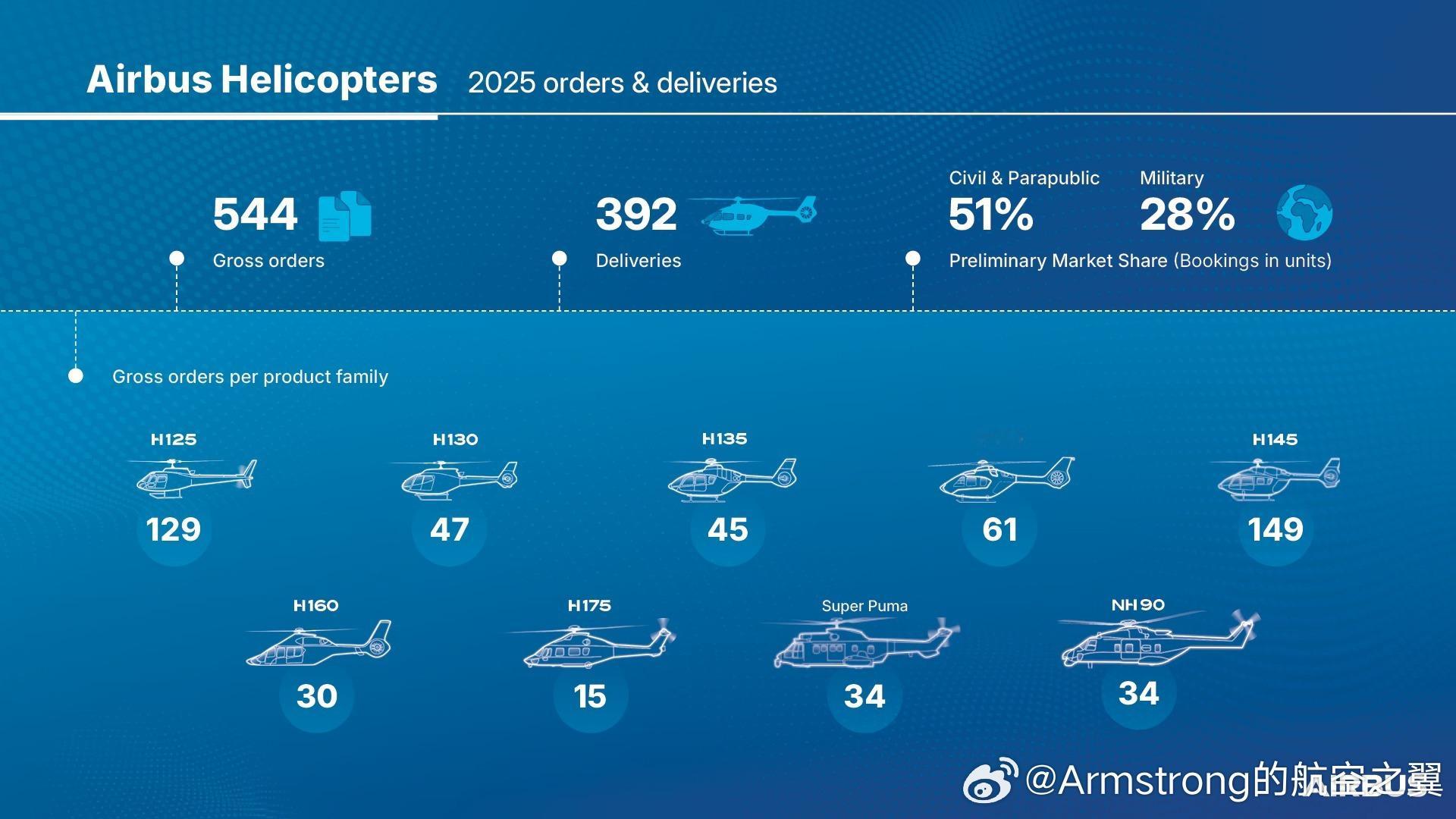 空中客车直升机于 2026年1月26日 公布了其2025年业绩。航空创作计划 2025年共交付392架直升机,较2024年的361架增长约 8.5%。总计获得544架总订单(净订单为536架),订单量同比大幅增长近20%。在民用及公共服务市场占据 51% 的份额。在军用市场份额上升至28%。业绩增长主要受益于欧洲国防预算的显著提升。主要订单包括来自西班牙的100架军用直升机历史性大订单,以及德国追加的20架H145M订单。