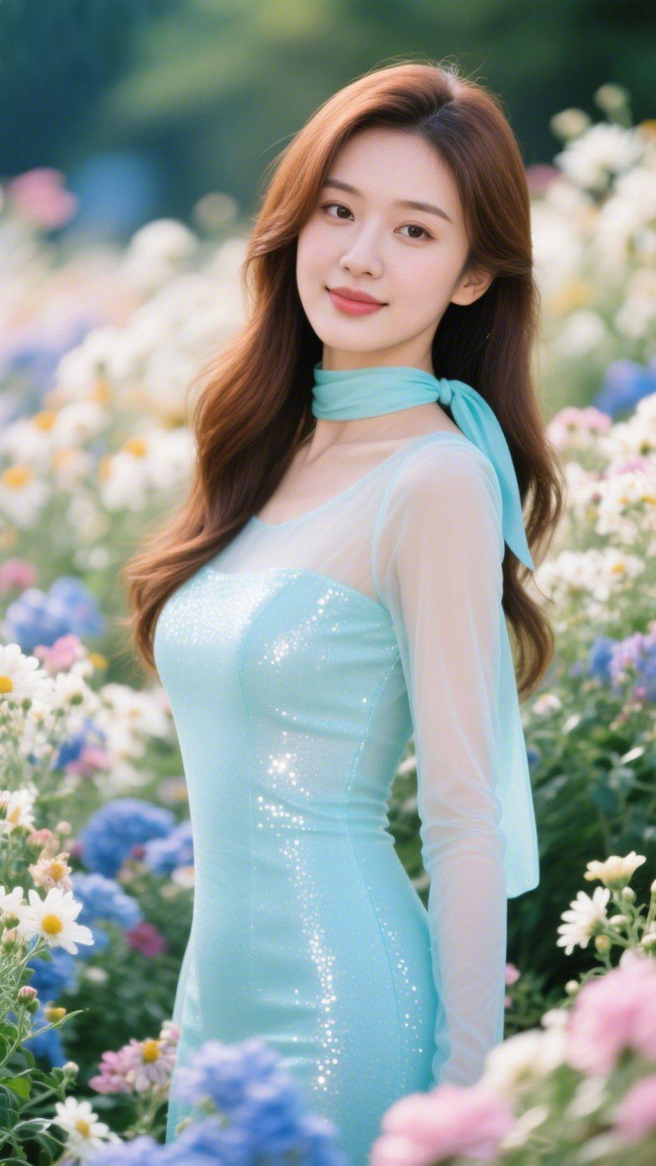 青裙与花野的柔 花野的风携香漫过,她似把春溪的浅蓝织入裙间——青裙缀着细碎柔光,颈间飘带融作花田的温软。 长发垂落,发梢轻蹭花瓣的粉,风的节奏都浸着清甜。笑意落处,花野的喧闹被滤作妥帖的暖。 这不是灼眼的亮,是花隙漏下的光斑,是裙角沾着的香,温温柔柔将春甜揉进日常。抬眼时,眉目里的静和,像新沏的春茶,让这片花田都浸着舒展的柔。 春日青裙雅韵 花野清新感
