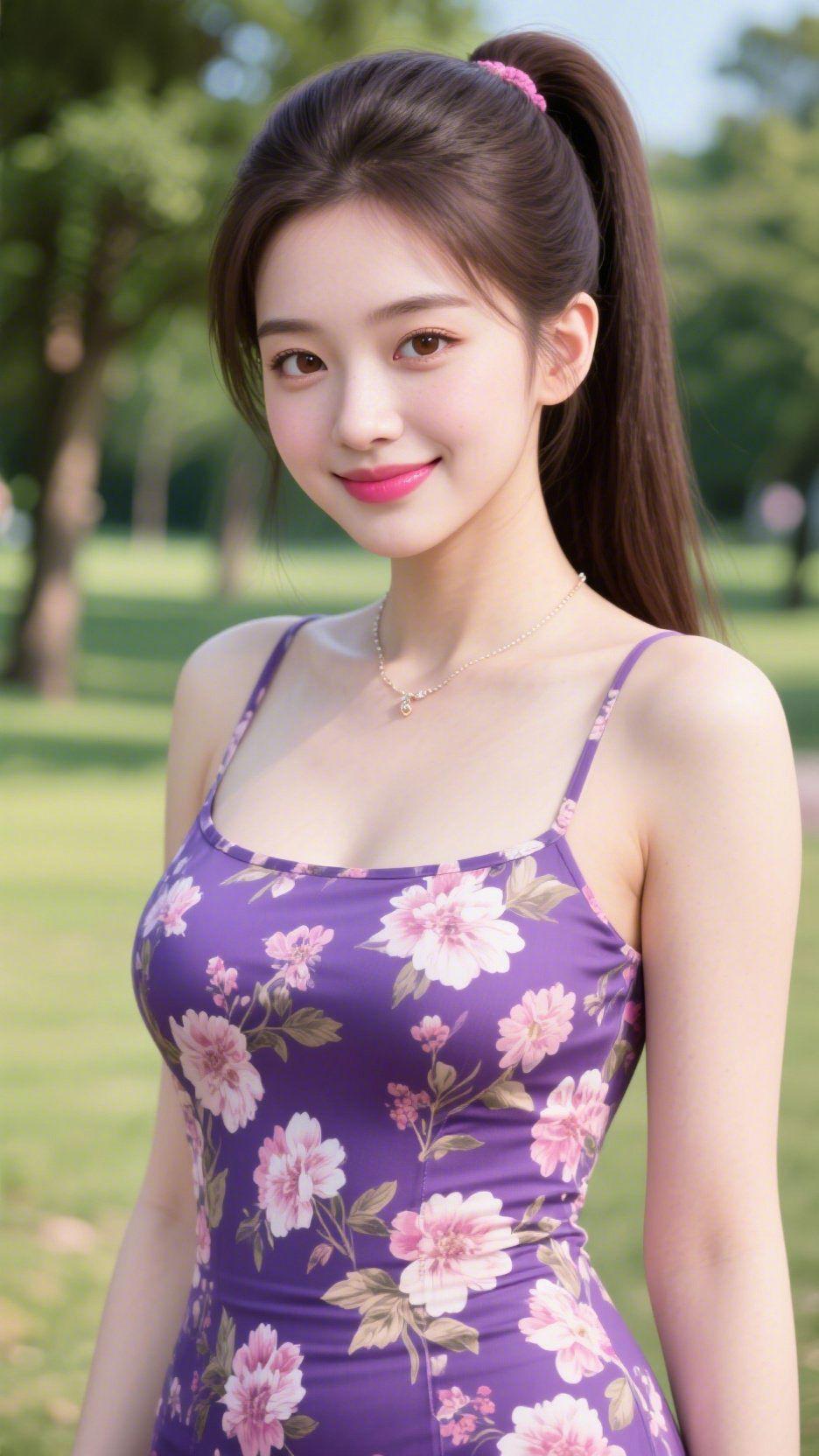 紫裙里的夏光柔 草坪的绿意漫过裙边时,她像把夏花织进了衣间——紫裙衬着轻软的花色,如将暮春蔷薇的柔意融作裙身的纹路。 高束的马尾缀着淡粉饰带,颈间细链的微光轻晃,连风掠过的节奏都浸着清甜。唇畔的淡色似沾了晨露的花,与身后树影晕成夏的模样。 这不是浓烈的艳,是草坪上新落的光斑,是风里裹着的草香,温温柔柔便将夏日的甜揉进日常。抬眼时,眉目里的软意,像冰镇果茶的清润,让寻常时刻都浸得明亮舒展。 夏日碎花裙雅 户外清新感