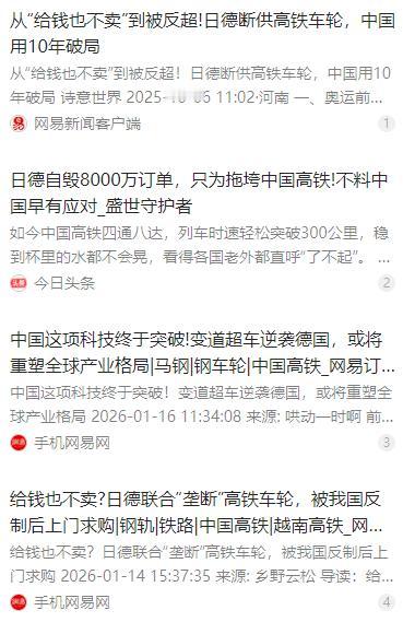 价值上亿的高铁订单被西方企业撕毁,嘲笑中国技术落后,却没料到中国团队逆袭!国产高铁车轮超越国际标准,彻底打破日德垄断,全球震动! 麻烦看官老爷们右上角点击一下“关注”,既方便您进行讨论和分享,又能给您带来不一样的参与感,感谢您的支持! 2008 年北京奥运会开幕前夕,中国向日本、德国两家企业签下的 8000 万美元高铁车轮订单,被对方突然撕毁。这两家长期垄断全球高铁车轮市场的企业,以不可抗力为由拒绝交付,宁愿赔付违约金,也想掐住中国高铁发展的命脉,还公然嘲笑中国造不出合格的高铁车轮,技术水平差得太远。 彼时的中国高铁,正处在起步发展的关键阶段,高铁车轮这一核心部件完全依赖进口。日德企业凭借技术优势,将一对高铁车轮卖到 60 万元,一列 8 节编组的高铁更换车轮就要近 2000 万,定价权和供应节奏全由对方掌控,甚至还多次出现优先供应本国、中国排队等货的情况。 更让人无奈的是,为了长期垄断市场,日德企业对高铁车轮核心技术实行严格封锁,秉持着不申报专利、不发表论文、不接受技术交流的三不原则,把核心技术捂得严严实实,根本不给中国学习和借鉴的机会。他们笃定,没有进口车轮,中国高铁只能停摆,最终还得低头求购。 但日德企业的如意算盘打错了,中国早已意识到核心技术不能受制于人,从 2004 年起,就安排马鞍山钢铁厂悄悄组建高铁车轮研发团队,布局自主研发。面对断供危机,国家战略层面全力推动,集结了业内顶级的材料专家、机械工程师和热处理技术员,让马钢研发团队成为了破局的主力军,一场自主研发的攻坚战正式打响。 高铁车轮看似是普通的铁疙瘩,实则是技术含量极高的精密部件。时速 300 公里的行驶状态下,它要承受整车重量、铁轨摩擦,制动瞬间还会产生上千度高温,1998 年德国 ICE 高铁脱轨事故,就是因为车轮金属疲劳引发,这对车轮的材料和工艺提出了近乎苛刻的要求。 研发的起步阶段难如登天,没有任何技术资料和工艺参数可以参考,团队只能从拆解进口车轮开始。他们用光谱仪分析每克金属的成分,把车轮扔进极端环境做疲劳测试,用高速摄像机记录断裂瞬间,一点点摸索其中的技术门道,光是光谱分析的数据就记满了几十本笔记本。 最棘手的难题是钢材配比,高铁车轮既要足够硬才能抗磨损,又要具备韧性防止断裂,普通车轮的氧含量允许百万分之十五,高铁车轮却必须压到百万分之几。研发人员反复试验,试了 107 种材料配方,报废的钢锭堆成了小山,一炉钢要炼 72 小时,温度差 10 度就前功尽弃。 2009 年寒冬,首个国产高铁车轮样品出炉,可在疲劳测试中,第 8 万次循环就出现了裂纹,远未达到国际标准的 30 万次。但研发团队没有气馁,反而从失败中总结经验,自创了逆向热模拟法,把车轮置于 - 40℃至 600℃的交变环境中,通过数万次计算反推材料应力变化。 功夫不负有心人,经过无数次的试验和调整,研发团队终于找到了中碳钢微合金的最佳配比,攻克了车轮核心材料的难题。他们还创新采用多阶段真空精炼工艺,将钢水中的氢含量稳定控制在 2PPM 以下,解决了氢元素引发的白点缺陷问题,让车轮的材质稳定性大幅提升。 2010 年春天,马钢研发的 D1 型高铁车轮装上和谐号动车组,开启了 64 万公里的魔鬼测试。从京津城际到武广高铁,车轮在不同气候、不同路况下连续运行,最终磨损量仅为进口产品的 70%,各项性能指标全部达标,国产高铁车轮迈出了商业化应用的第一步。 但日德企业依旧不以为然,嘲讽中国的国产车轮只能跑 200 公里时速,达不到 350 公里的高速标准。面对质疑,研发团队继续打磨技术,不断优化车轮的设计和工艺,在精密加工上做到极致,让直径 900 毫米的车轮加工精度达到 ±0.001 毫米,相当于头发丝的十分之一。 2017 年,马钢研发的时速 350 公里高速车轮,顺利通过中铁检验认证中心的 CRCC 认证,正式装车复兴号动车组,彻底打破了 350 公里时速车轮必须进口的神话。这一成果意味着,中国终于实现了高铁车轮的自主可控,不再被日德企业卡脖子。 此后,国产高铁车轮的技术水平不断突破,在各项严苛测试中表现亮眼,零下 60 摄氏度的低温冲击测试、百万次高强度疲劳试验,全都顺利通过。2023 年,在福厦线 CR450 动车组试验中,国产车轮跑出了 453 公里的时速,创下全球车轮运行速度纪录。 2024 年,一组数据更是让世界震惊:整列装用马钢车轮的复兴号,最长载客安全运行里程突破 100 万公里,远超日德产品 80 万公里的上限。而国产高铁车轮的成本,较进口产品下降了 40%,一对车轮的价格从 60 万元大幅降低,彻底终结了日德企业的天价车轮时代。