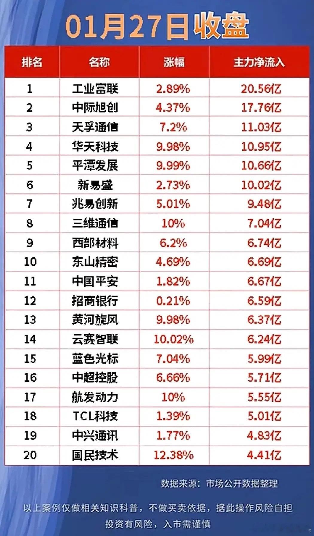 1月27日收盘主力资金净流入梳理!本日呈现出硬科技为主线、多板块轮动的特征。算力、半导体、光通信等AI产业链核心方向是资金重点布局领域,同时金融、军工、新材料等板块也获得资金关注。从涨幅来看,多只个股涨停或接近涨停,反映出资金推动力度较强,市场情绪整体偏活跃。个股梳理1. 工业富联:作为全球电子制造龙头,主营通信、云计算设备等,当日获20.56亿主力资金净流入,涨幅2.89%。受益于AI算力需求增长及电子产业链复苏,资金长期布局意愿强烈。2. 中际旭创:全球光通信核心供应商,专注光模块研发,当日获17.76亿主力资金净流入,涨幅4.37%。AI算力网络建设带动高速光模块需求爆发,行业景气度持续上行。3. 天孚通信:光通信无源器件核心厂商,为头部光模块企业提供组件,当日获11.03亿主力资金净流入,涨幅7.2%。伴随AI算力需求增长,光器件行业需求旺盛,业绩增长确定性较强。4. 华天科技:国内半导体封测龙头,提供集成电路封装测试服务,当日获10.95亿主力资金净流入,涨幅9.98%涨停。受益于半导体周期复苏及先进封装国产替代,行业空间持续打开。5. 平潭发展:主营造林营林、木材加工,布局清洁能源产业,当日获10.66亿主力资金净流入,涨幅9.99%涨停。受区域政策及生态经济利好催化,资金短期炒作情绪浓厚。6. 新易盛:专注光模块及光器件生产,服务数据中心及运营商,当日获10.02亿主力资金净流入,涨幅2.73%。AI算力驱动高速光模块放量,行业需求持续上行,公司订单饱满。7. 兆易创新:国内存储芯片设计龙头,主营闪存芯片、MCU等,当日获9.48亿主力资金净流入,涨幅5.01%。存储芯片周期反转叠加国产替代加速,产品竞争力持续提升。8. 三维通信:主营通信网络优化设备,布局卫星通信业务,当日获7.04亿主力资金净流入,涨幅10%涨停。卫星通信产业政策利好及下游需求增长,推动资金关注度快速提升。9. 西部材料:国内稀有金属材料龙头,主营钛合金、难熔金属等,当日获6.74亿主力资金净流入,涨幅6.2%。航空航天、军工等高端装备需求增长,材料国产化进程加快。10. 东山精密:主营精密制造及电子电路,服务消费电子、新能源领域,当日获6.69亿主力资金净流入,涨幅4.69%。消费电子复苏及新能源汽车需求增长,带动公司业绩改善。11. 中国平安:综合金融服务集团,涵盖保险、银行等业务,当日获6.67亿主力资金净流入,涨幅1.82%。金融板块估值修复及寿险改革成效显现,长期配置资金持续入场。12. 招商银行:国内领先股份制银行,主营零售及公司金融,当日获6.59亿主力资金净流入,涨幅0.21%。银行业绩稳健且估值低位,成为资金避险及配置的重要标的。13. 黄河旋风:国内超硬材料龙头,主营金刚石制品及培育钻石,当日获6.37亿主力资金净流入,涨幅9.98%涨停。培育钻石消费需求增长及工业金刚石应用拓展,催化资金炒作情绪。14. 云赛智联:主营云计算、大数据及智慧城市,布局算力基础设施,当日获6.24亿主力资金净流入,涨幅10.02%涨停。东数西算工程推进及AI算力需求增长,推动业务快速发展。15. 蓝色光标:国内营销传播龙头,布局AI营销及元宇宙,当日获5.99亿主力资金净流入,涨幅7.04%。AI技术在营销领域应用落地及行业复苏,带动业务结构优化。16. 中超控股:主营电线电缆、超导材料,布局新能源及军工,当日获5.71亿主力资金净流入,涨幅6.66%。超导技术产业化进展及新能源电缆需求增长,吸引资金短期布局。17. 航发动力:国内航空发动机龙头,主营制造及维修,当日获5.55亿主力资金净流入,涨幅10%涨停。军工行业高景气度及国产大飞机配套需求,支撑业绩增长确定性。18. TCL科技:全球显示面板龙头,布局半导体显示及光伏,当日获5.01亿主力资金净流入,涨幅1.39%。面板行业周期复苏及光伏盈利改善,带动估值修复。19. 中兴通讯:国内通信设备龙头,主营5G基站、服务器等,当日获4.83亿主力资金净流入,涨幅1.77%。5G建设推进及AI算力服务器需求增长,支撑业绩持续释放。20. 国民技术:主营安全芯片、MCU及功率半导体,布局AIoT及汽车电子,当日获4.41亿主力资金净流入,涨幅12.38%。半导体国产替代加速及AIoT需求增长,推动资金短期炒作。总结今日资金净流入前20的个股,核心反映了市场对硬科技主线的高度认可,算力、半导体、光通信等AI产业链成为资金核心布局方向,同时金融、军工、新材料等板块也获得资金分流。短期来看,资金推动下相关个股活跃度较高,但需注意板块轮动及情绪波动风险;长期投资仍需聚焦公司基本面、行业景气度及国产替代进程。
