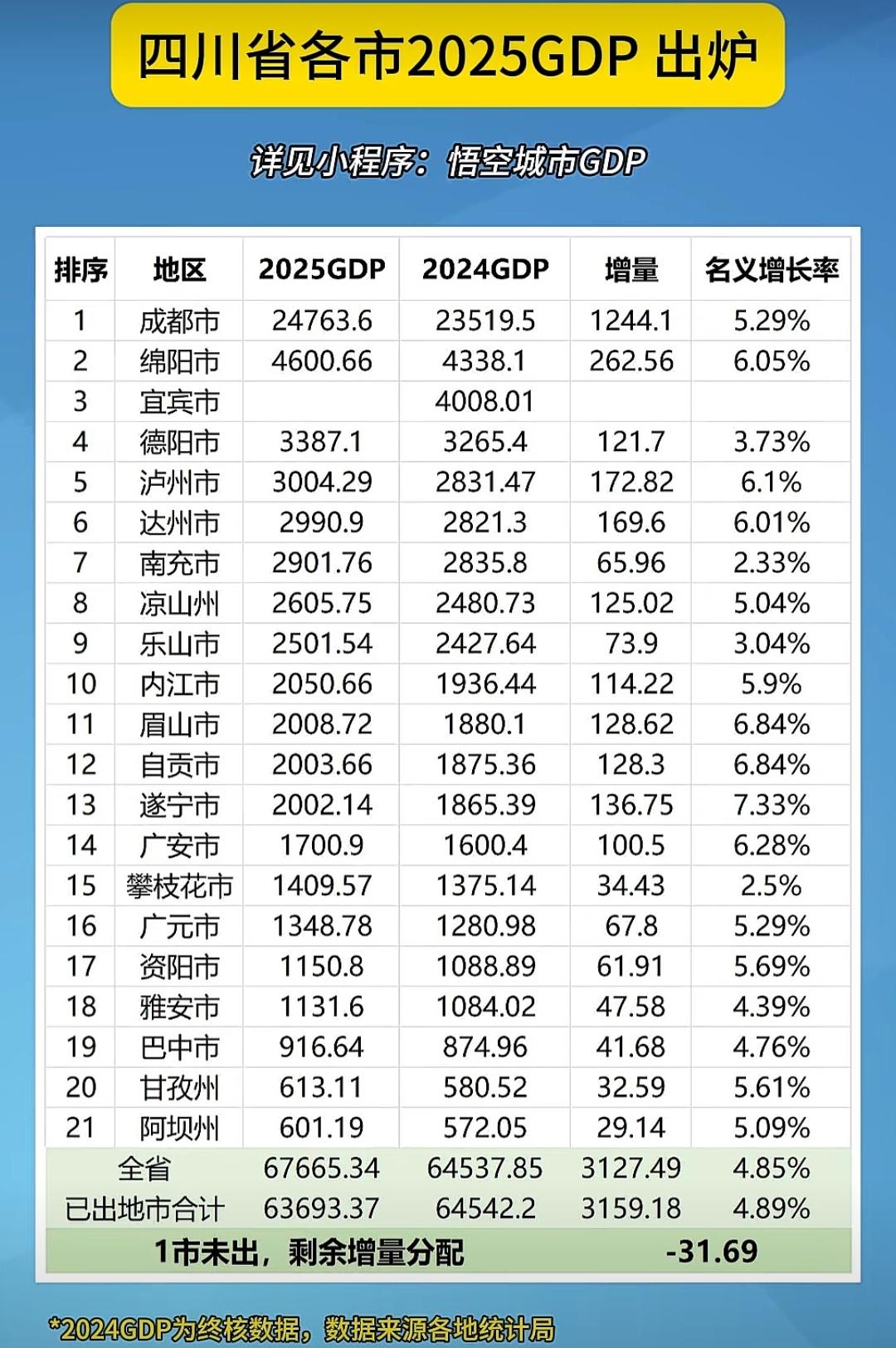 今天省内经济数据的看点都集中在了南泸达的经济体量上了,增量在100亿以下的就属南充、乐山、攀枝花较低,增速都在3左右,而绵泸达增量排名靠前(成都除外),希望南充能够奋起直追,不要再往下掉了,而省会成都和各地市间的差距逐渐拉大,除了强省会战略模式,四川更应该关注各地市之间的平衡发展和经济副中心建设,以期带动各个区域间的均衡发展和经济民生保障。