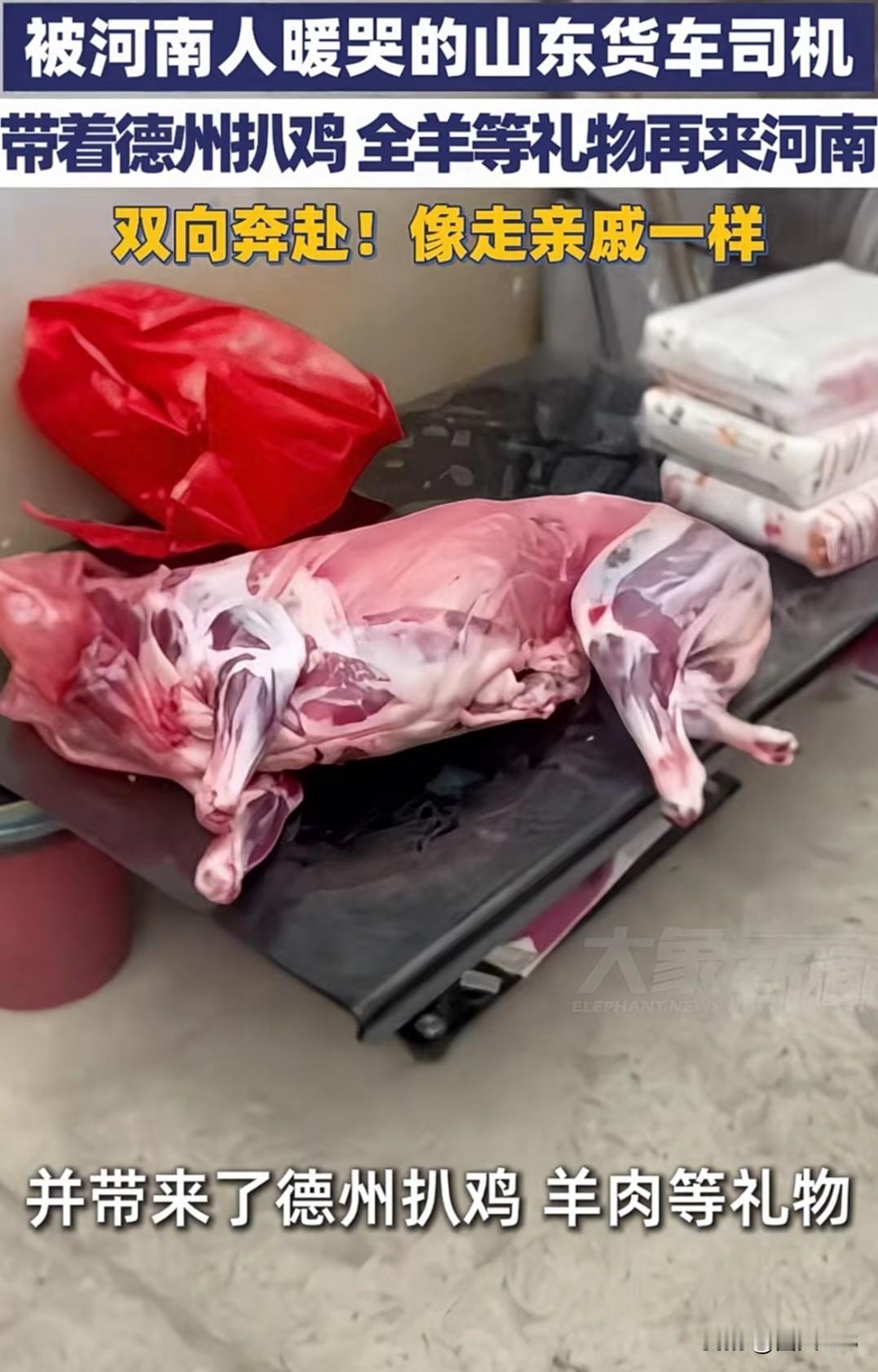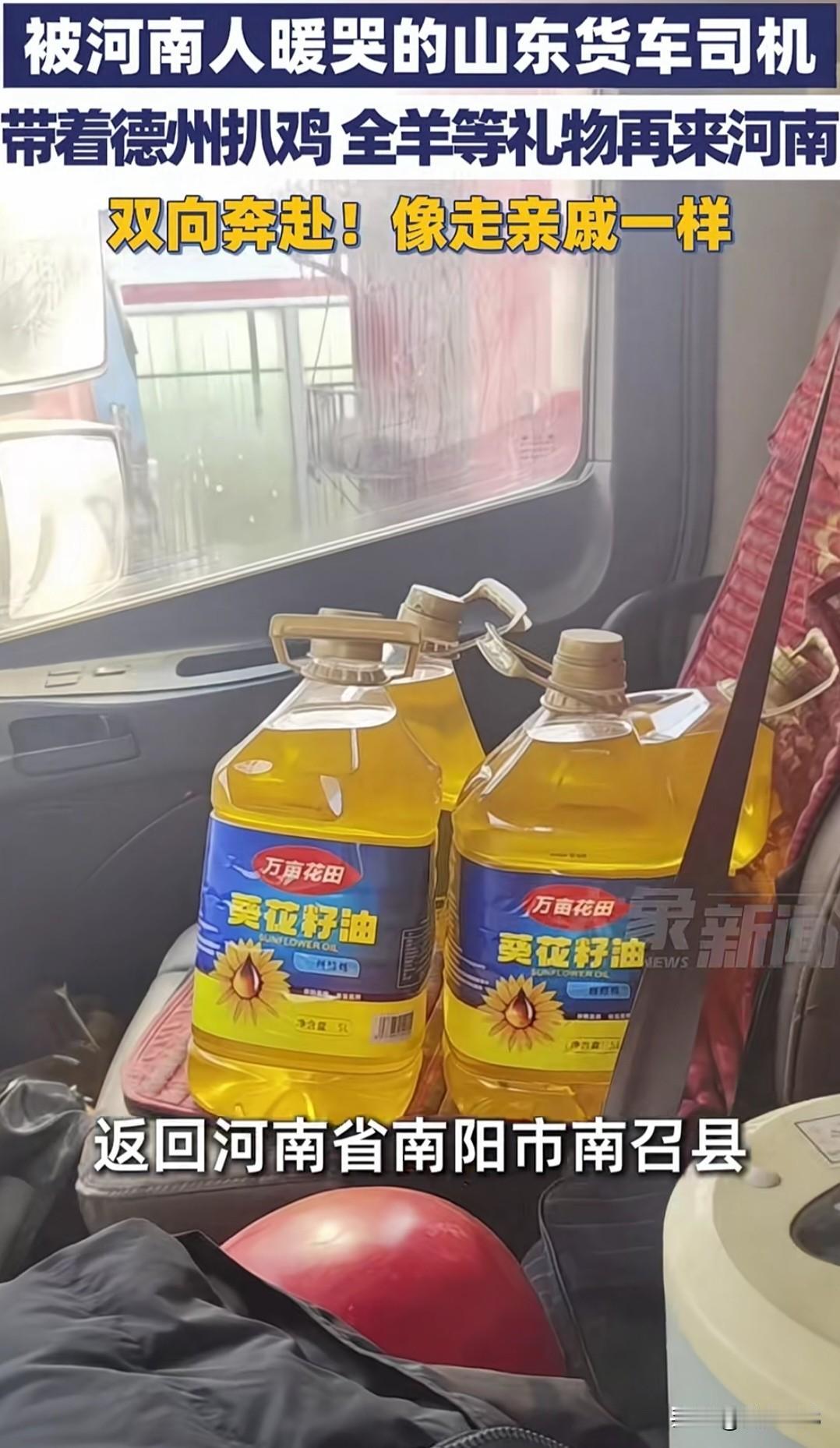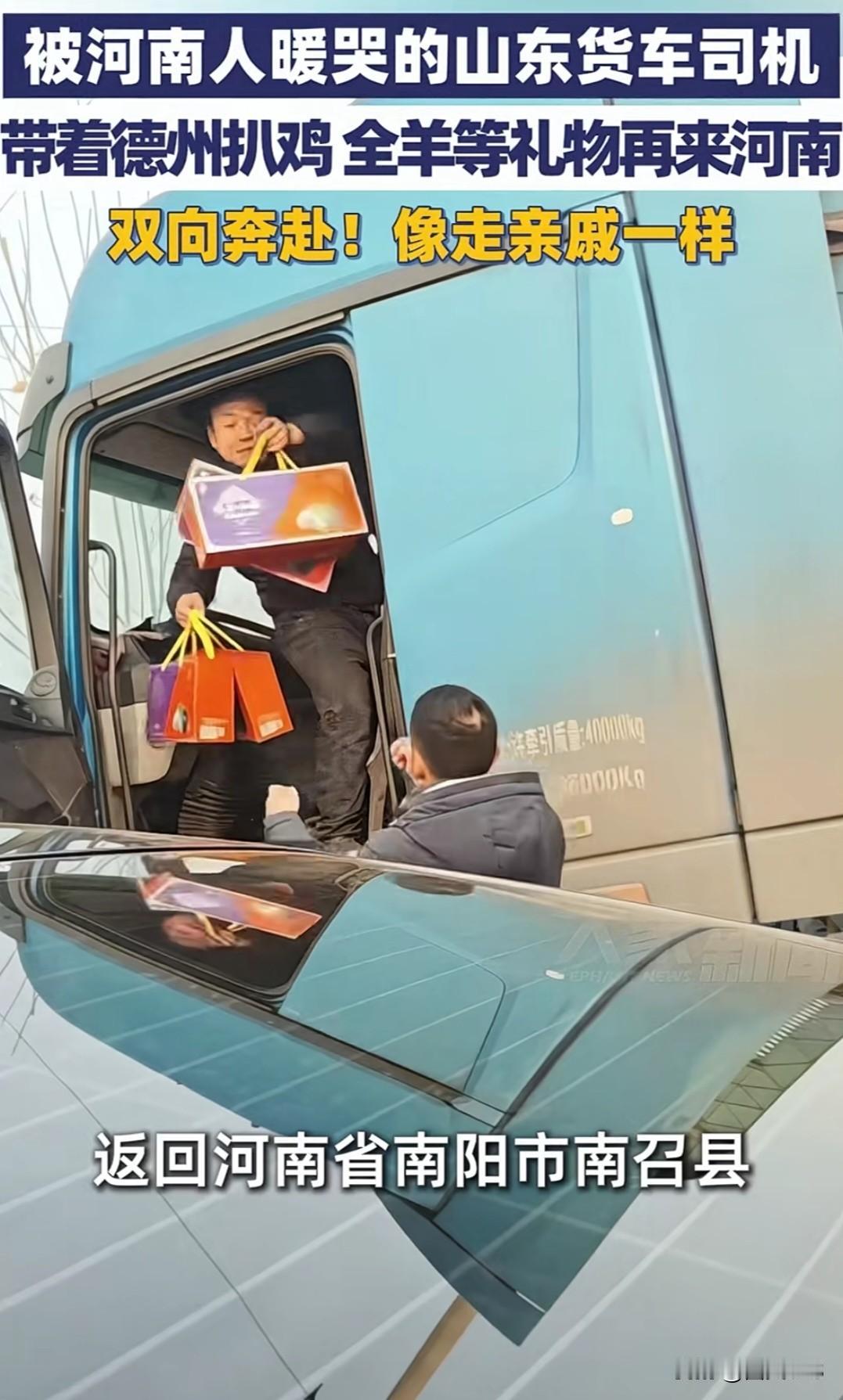 令人感动,双向奔赴的一个故事! 被河南人暖哭的山东货车司机,再回河南,带着德州扒鸡 全羊等礼物再来河南,双向奔赴,像走亲戚一样! 山东货车司机“小飞哥”王玉志和河南南阳好心人的故事就是如此。 1月19日,大雪让王玉志被困河南南阳,王京三三姐妹邀他回家吃饭,做了好几个菜,附近还有不少老乡关心他。王玉志感动落泪,记录下“河南人真中”。 1月26日,王玉志带着德州扒鸡、羊肉等满满一车礼物回河南致谢,德州志愿者也带来棉被、香油等特产。现场热闹得像走亲戚。王玉志说河南是他第二个家乡。这场跨越鲁豫的感恩回访,是个体善举,更让“鲁豫一家亲”有了温暖注脚。