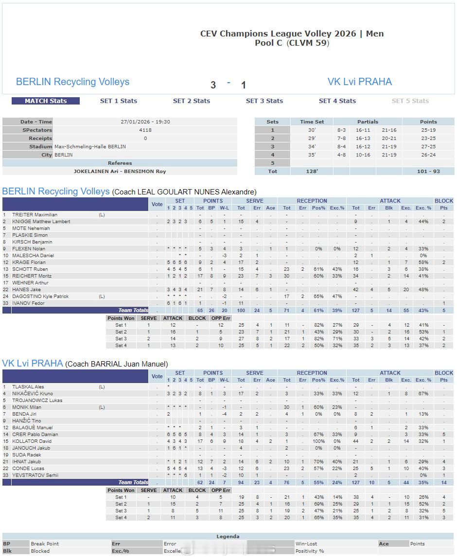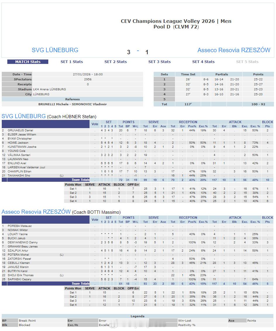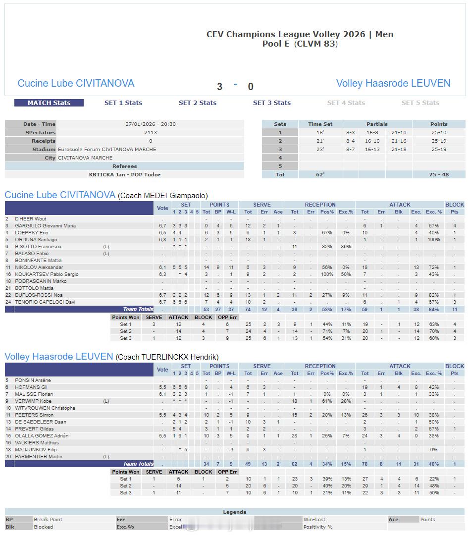 【欧冠男排卢布林惊天大逆转取四连胜 MVP莱昂26分】国际排坛战报速递 1月27日,欧冠男排第四轮第四回合,B组波兰卢布林主场在先失两局的情况下上演大逆转,3-2(22-25/23-25/27-25/25-16/15-13)艰难战胜比利时鲁瑟拉勒,取得四连胜。MVP莱昂26分、亨诺18分、格罗兹达诺夫12分、扬10分,德姆奥克斯27分、埃斯佩兰德18分、希克斯纳11分。另外三场比赛赛果如下:C组:德国柏林3-1(25-19/23-25/27-25/26-24)捷克布拉格D组:德国吕讷堡3-1(25-22/25-27/25-23/25-20)波兰热舒夫E组:意大利奇维塔诺瓦3-0(25-10/25-19/25-19)比利时鲁汶