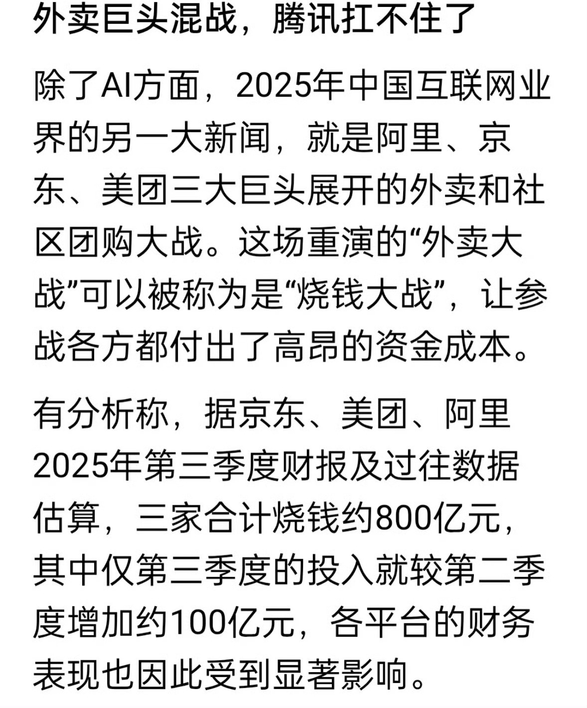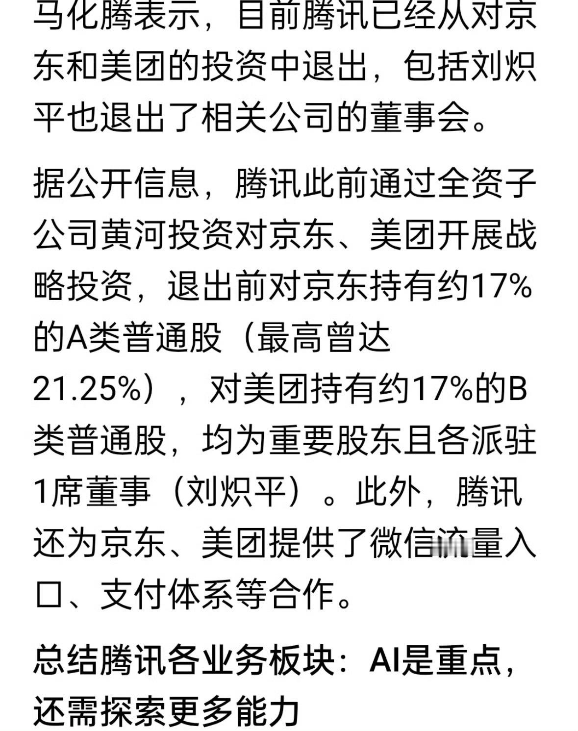 马化腾称腾讯已从美团京东投资中退出 看到了商业的本质了,靠超级烧钱的,真不持久,转成AI,马化腾称腾讯已从美团京东投资中退出