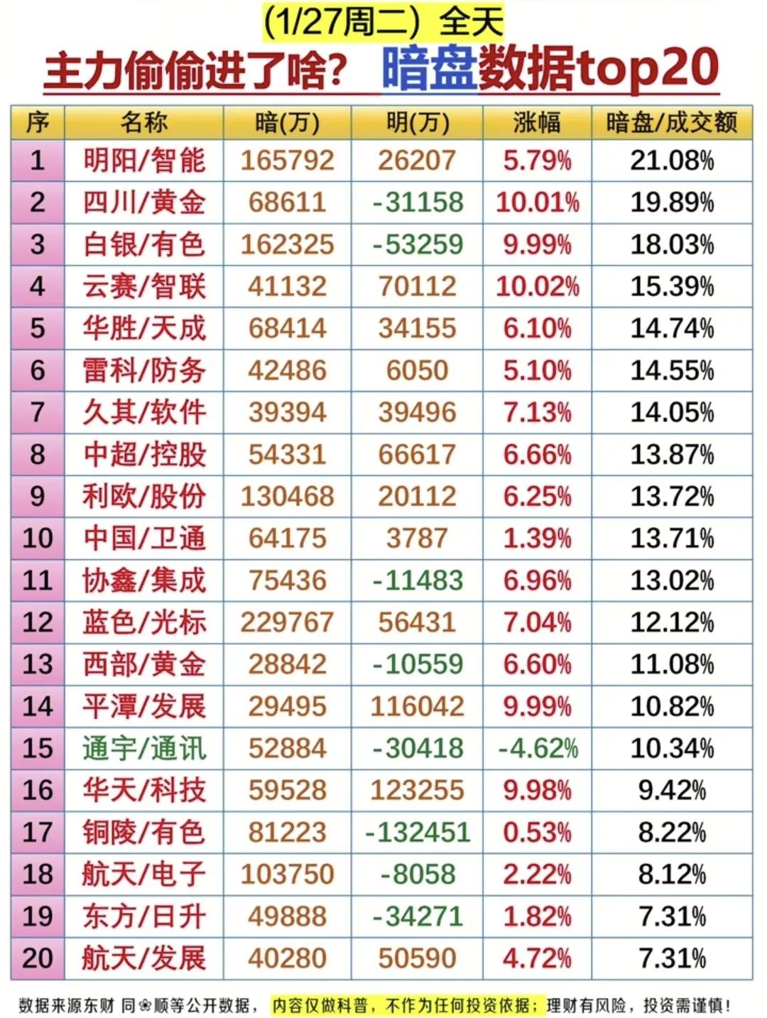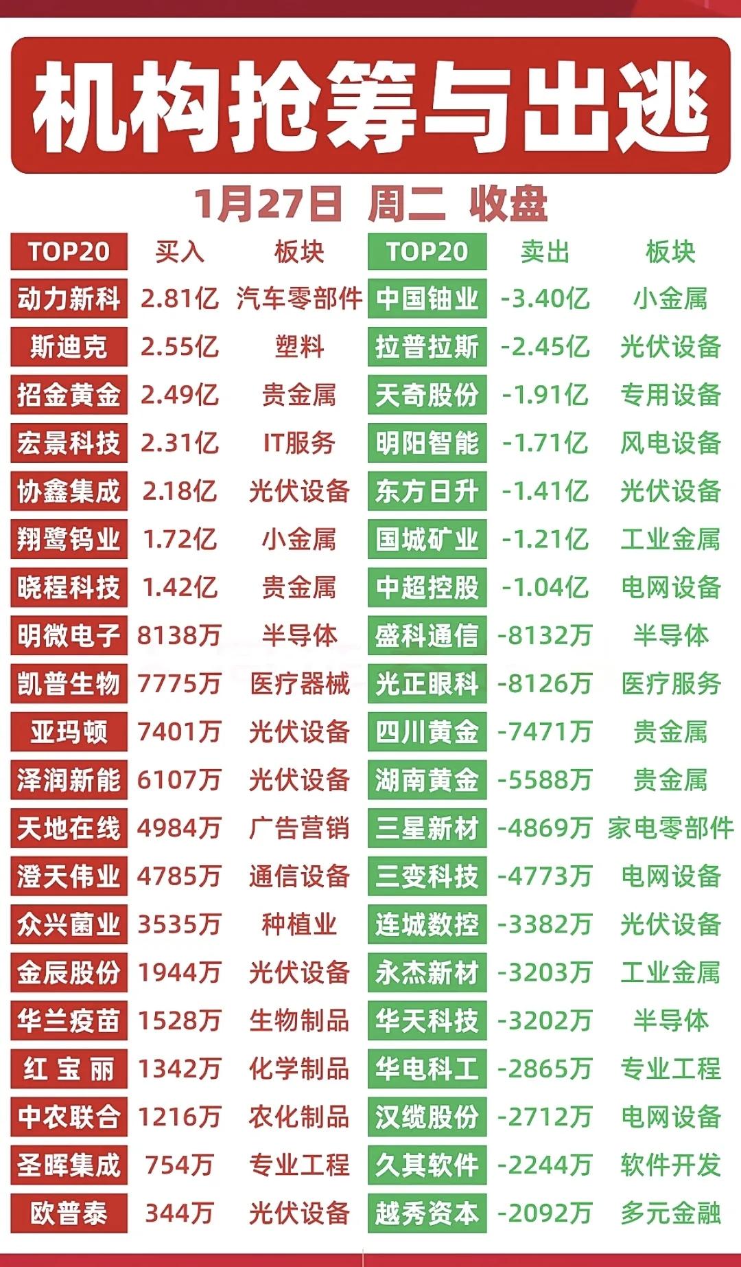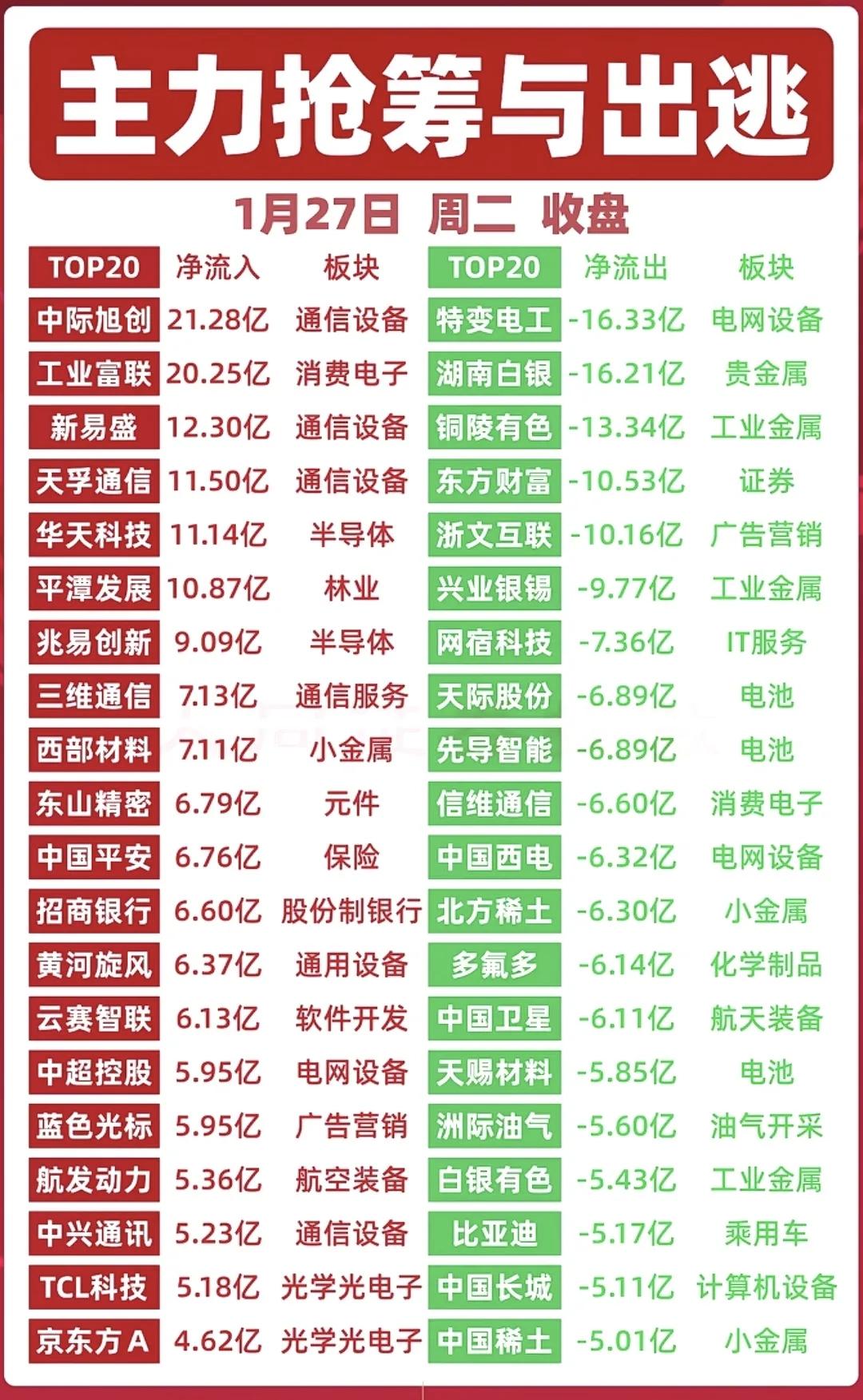 🚨1月27日资金大战全曝光!游资、主力、机构抢筹出逃名单等等。跟大资金不会迷路! ✅游资动向:平潭发展获多路游资抢筹,三亚迎宾路、成都北一环路等席位大手笔入场。 ✅主力资金:通信设备、半导体成抢筹主战场,中际旭创、工业富联获20亿级资金流入; ✅暗盘数据:明阳智能、白银有色暗盘资金流入居前,四川黄金、云赛智联暗盘+明盘合力推升股价…… ✅机构动作:动力新科、斯迪克获机构大额买入,光伏设备、贵金属板块出现机构分歧。 市场资金暗流涌动,板块轮动加速,看懂资金脉络,才能更好把握节奏! (注:以上内容仅为数据复盘,不构成投资建议)游资龙虎榜 游资资金 资金活跃板块 游资操盘手 游资交易 游资抱团股