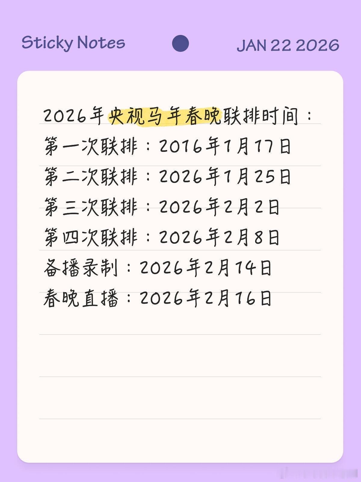 2026年央视马年春晚联排时间第一次联排:2026年1月17日第二次联排:2026年1月25日第三次联排:2026年2月2日第四次联排:2026年2月8日备播录制:2026年2月14日春晚直播:2026年2月16日春晚联排‖