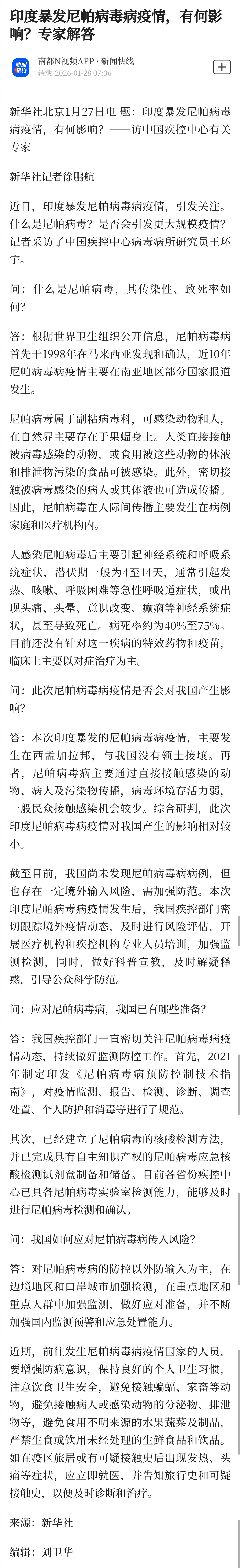 【#中疾控解读尼帕病毒输入风险##我国已具备尼帕病毒检测能力#】近日,印度暴发尼