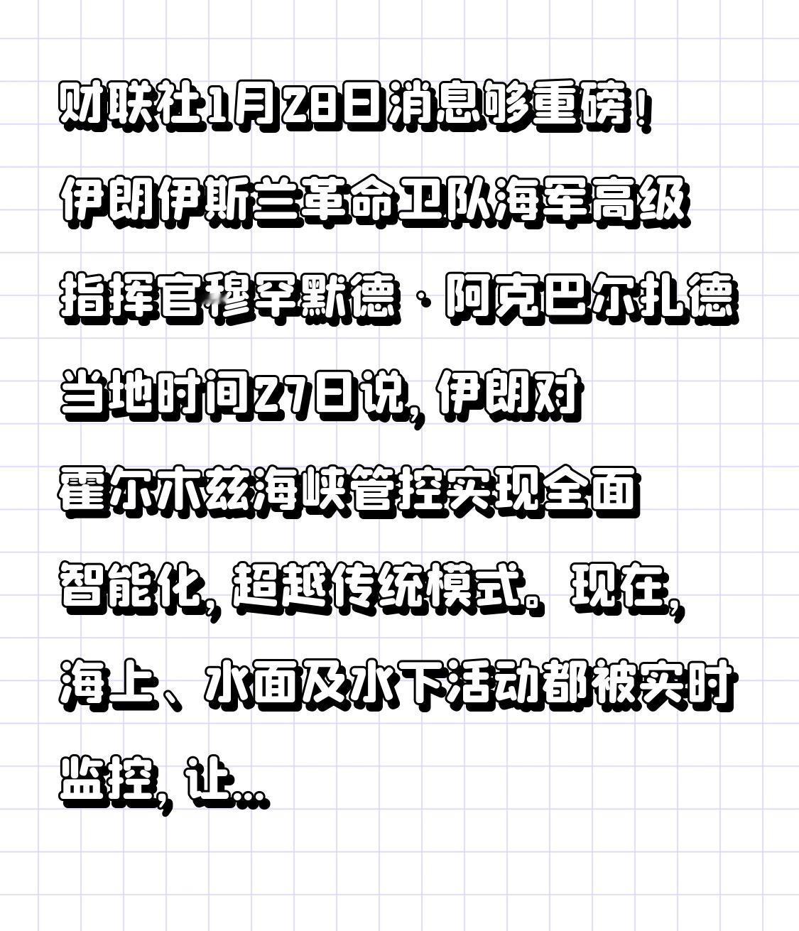 财联社1月28日消息够重磅!伊朗伊斯兰革命卫队海军高级指挥官穆罕默德·阿克巴尔扎德当地时间27日说,伊朗对霍尔木兹海峡管控实现全面智能化,超越传统模式。 现在,海上、水面及水下活动都被实时监控,让伊朗掌握了船只通行的决定权。这可是全球约三分之一海运原油贸易的必经之地,战略意义非凡。 阿克巴尔扎德还表明,伊朗不主动挑事,但周边国家若把领土用于针对伊朗,那就会被视为敌对。看来伊朗在维护自身利益和地区安全上,有了更有力的手段和坚定的决心。