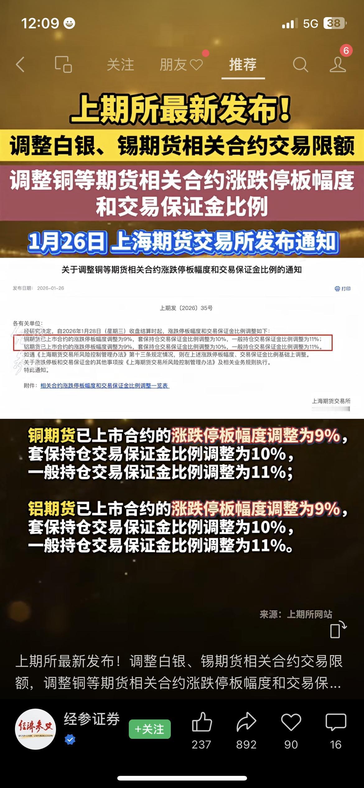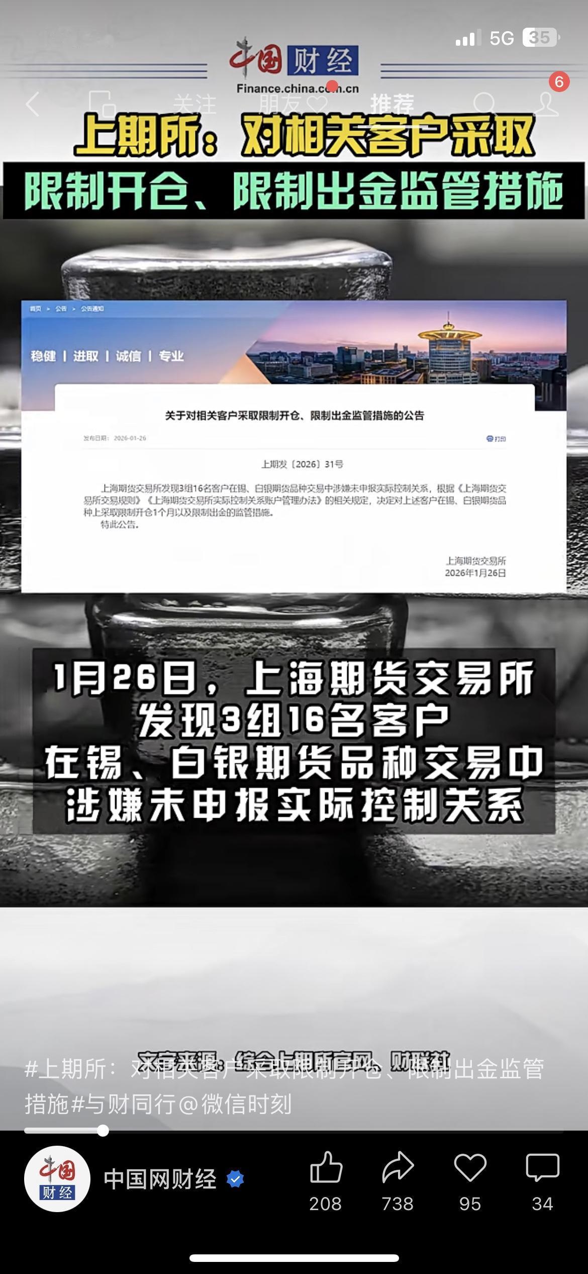 📢上期所出手!限制16名客户开仓出金 上期所发现3组16名客户在锡、白银期货交易中违规,直接采取限制开仓、限制出金措施,同时调整白银、锡期货交易限额。 我做期货的朋友说,这是为了遏制过度投机。 你觉得这能稳住贵金属期货价格吗? 上期所 期货监管 财经热点 市场有风险,投资需谨慎