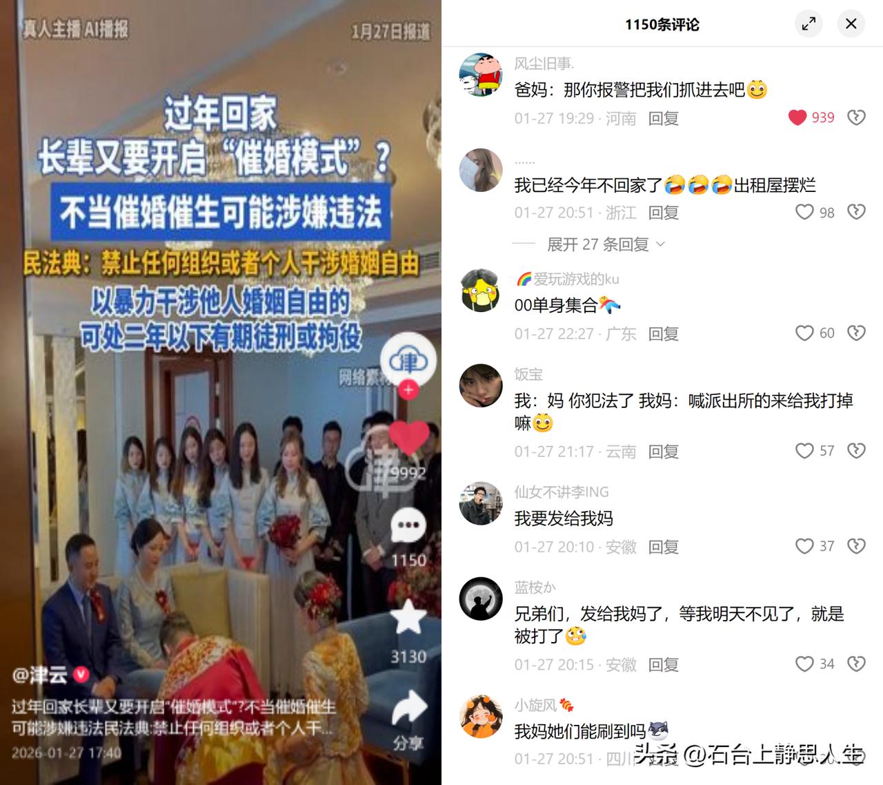 催婚触法?大家反应扎心了 最近有媒体说,春节长辈过激催婚可能违反民法典,严重的还涉及刑法。但留言里全是扎心的调侃,那你找帽子叔叔抓我吧、已踢出家族群,不少年轻人干脆躲在出租屋摆烂,连家都不回。 这事儿看着是普法,实则直击了代际矛盾的死穴。法律确实划了清晰的边界,但真要把催婚的爸妈送进去?别说法律程序要求亲告才处理,就算能走流程,哪个子女真能狠下心撕破脸? 年轻人的调侃和摆烂,并非不懂法,主要是太懂现实了。跟爸妈讲婚姻自由的大道理,不如甩个玩笑打哈哈;跟家族的催婚压力硬刚,不如躲出去眼不见为净。这种软反抗,说白了是在自我选择和家庭期待之间,找个不伤和气的台阶下。 毕竟,比起冰冷的法条,我们更缺的是一场能坐下来好好聊的对话。你今年怎么应对催婚的?