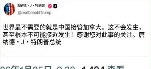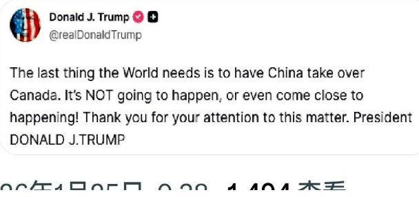 1月25号凌晨,特朗普一条动态,又突然炸了!没有前因后果,没有长篇大论,就这么一句:世界最不需要中国接管加拿大,这绝不能发生! 事情得从之前的中加经贸磋商说起,1月15日,两国签署了首份《经贸合作路线图》,在李强总理和加拿大总理卡尼共同见证下,敲定了一系列合作事项,这不是表面功夫,而是实打实的双向奔赴,给双方民众都带来了好处。 最受关注的就是新能源汽车领域,加拿大宣布每年允许近5万辆中国电动车,以6.1%的最惠国税率进入本地市场,这对加拿大消费者来说是好事,能用上高性价比的绿色车型,还能倒逼本土产业升级,助力环保目标。 特朗普本就对加拿大的“转向”不满,美加之间的裂痕也早有苗头,只是中加合作让矛盾彻底摆上台面,特朗普一直想把加拿大绑在自己的战车上,可加拿大越来越清醒,不愿再做美国的附属品,毕竟跟着美国只能被动受牵制,和中国合作才能拿到实实在在的利益。 特朗普深夜发文,说白了就是既焦虑又无奈,他看着曾经的盟友主动和中国深化合作,看着中国新能源汽车凭实力打入北美市场,自己却无力阻拦,只能靠发动态发泄情绪,这种口不择言的指责,在国际上根本站不住脚。 美媒都看得明白,加拿大和中国合作是务实选择,不是什么短视行为,长期以来,北美新能源市场受保护主义影响,价格高、选择少,引入中国电动车既能降低民众生活成本,又能推动全球气候目标,是双赢的好事。 咱们中国向来坚持平等合作,和加拿大的往来从来都是相互尊重、互利互惠。所谓“接管”的说法,不过是特朗普出于政治目的的刻意炒作,想借此拉拢支持者,同时破坏中加关系,可惜算盘打错了。 特朗普的焦虑,本质上是对美国影响力衰退的不安,随着中国实力不断提升,越来越多国家愿意和咱们开展合作,这是大势所趋,靠威胁、指责阻拦不了时代潮流,唯有务实合作才能顺应发展。 美加关系的裂痕,也给其他国家提了个醒:盟友不是附属品,国家利益才是第一位的,加拿大敢于硬气回怼特朗普,敢于和中国深化合作,正是认清了这一点,这种理性务实的态度值得肯定。 国际舞台上,实力和诚意才是通行证,中国从不谋求所谓“接管”谁,只愿和各国携手共赢,特朗普的深夜发文终究只是一场闹剧,改变不了中加合作的大方向,更挡不住中国发展的步伐。 大家对此有什么看法呢?欢迎各位在评论区留言!