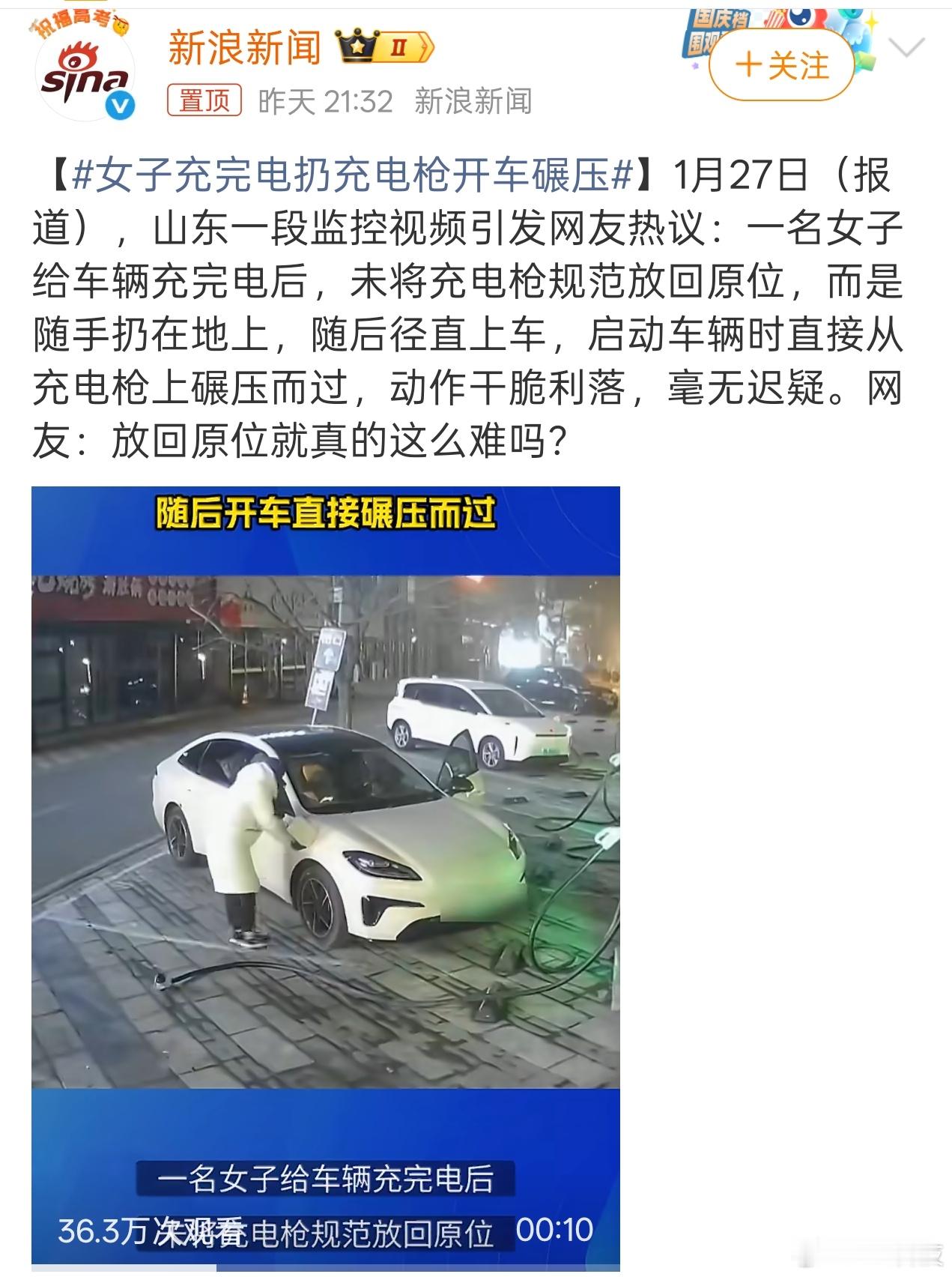 早,希望大家都是有素质的人~女子充完电扔充电枪开车碾压