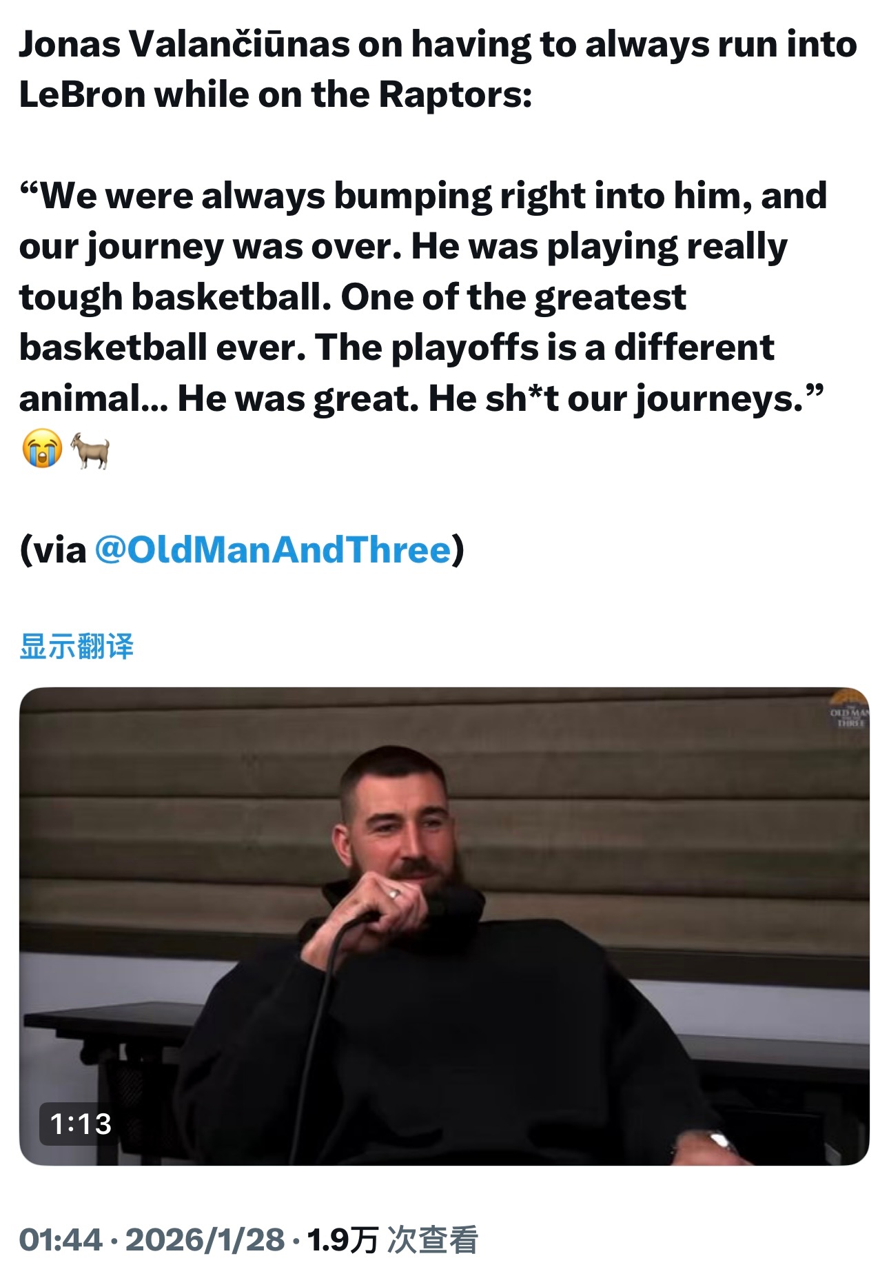 瓦兰丘纳斯聊起自己在猛龙效力时总是碰上勒布朗的经历:“我们每次都直接撞上他,然后整个赛季就直接交代了。他打球真的太硬了,绝对是历史最伟大的球员之一。季后赛的强度完全是另一个级别。他太强了,直接把我们的夺冠梦给干碎了。”🤣