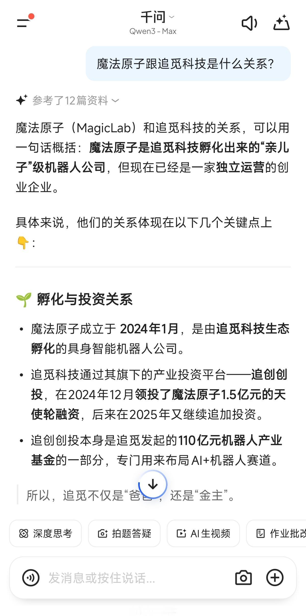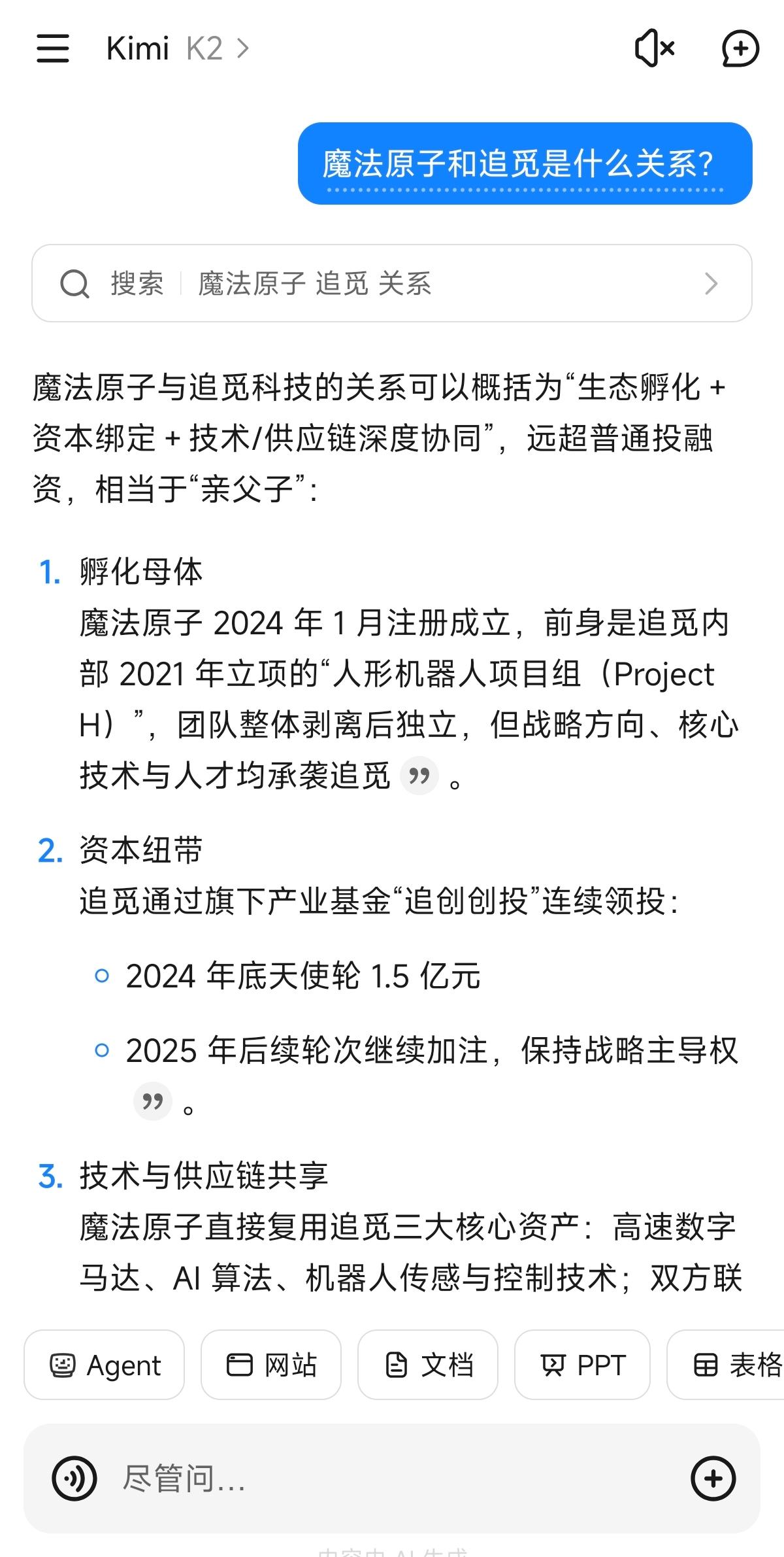 魔法原子跑来强调自己不是追觅基金孵化、跟追觅没关系。 这切割,窵。 具体两家有没有关系大家自行搜索,早期新闻稿件也可以看看。 不过,魔法原子这公司确实神奇,从2025年初的发布会,到吴长征变董事,再到砸钱春晚合作,一年冒了没几次泡,成立2年,然后今年就要琢磨IPO了。 而该公司目前最大的亮点就是他们想撇清关系的大股东与吴长征之前在小米机器人,以及跟春晚的合作……嗯……没了。 有人说智元机器人也才3年,不能以成立时长论英雄。 智元在机器人领域已是独角兽级别,它的背景与团队太硬了,年出货量都已经几千台,还收了一个上市公司,现金储备据说也很夸张,完全没可比性。 而魔法原子如果没有什么与什么的话,融资与产品是不是都有点点点压力? 不扯了,引用雷军那句话,风口来了,资本盛宴。今年机器人市场会很疯狂。 附:千问、KIMI、DeepSeek等大模型对于「魔法原子与追觅科技是什么关系」的回答。【来自懂车帝车友圈】
