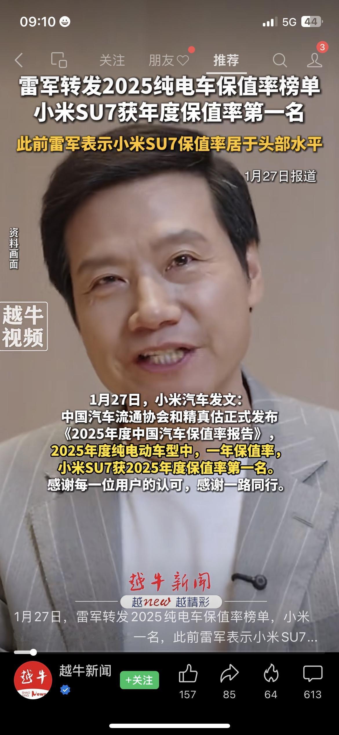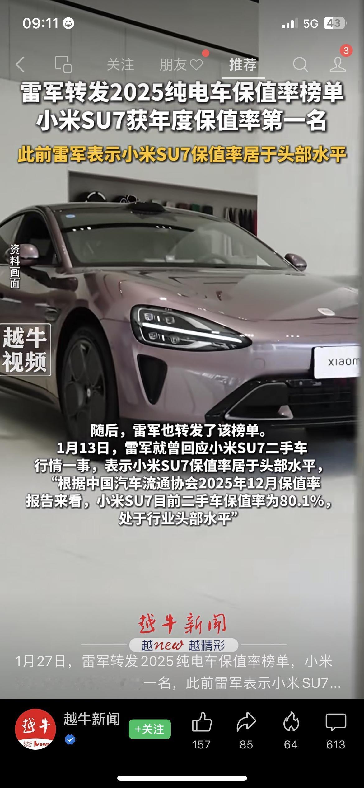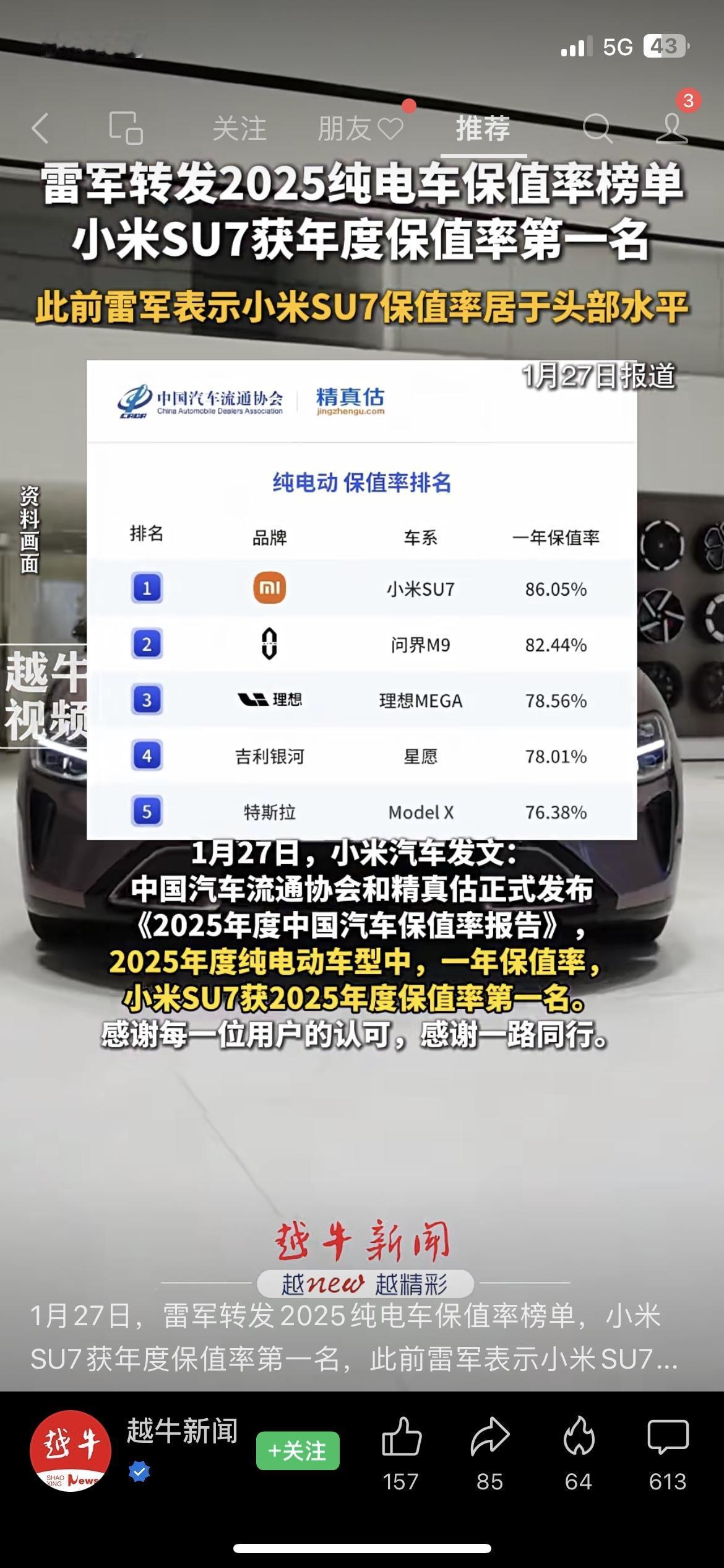 小米SU7保值率干翻特斯拉! 雷军刚转发的2025纯电车保值率榜单,小米SU7以86.05%的一年保值率拿了第一,比问界M9还高。咱们普通人买电车最扎心的就是开一年亏一半!现在小米这波直接把电车保值率卷到新高度。你会为了保值率放弃特斯拉选小米SU7吗? 小米SU7 电车保值率 财经热点