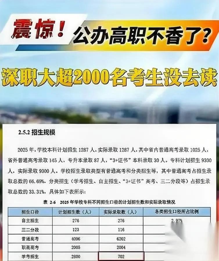 深职大春招爆冷?25%报到率吓我一跳。 不是学校不香,是被学霸当“安全垫”了——人家明明能冲本科,先拿深职大专科录取当保底,揣着通知书等夏天高考,考上本科直接跑,留一堆空名额。 最冤的是那些分数刚好够深职大、一门心思想春招上岸的娃:名额被“占着位置不兜底”的学霸挤没了,本来稳的路突然变窄。 可别听风就是雨,消失的2100个名额没浪费,全回流到高考池了——原本计划招4000多,最后收了6200,深职大还是那个“专科小清华”,你够不着的依旧够不着。 说到底,深职大没变,变的是有人把升学玩成了“策略局”。信息差和算盘,有时候比闷头读书还“精准”? 你们说,这是会规划还是钻空子?评论区聊聊呗~
