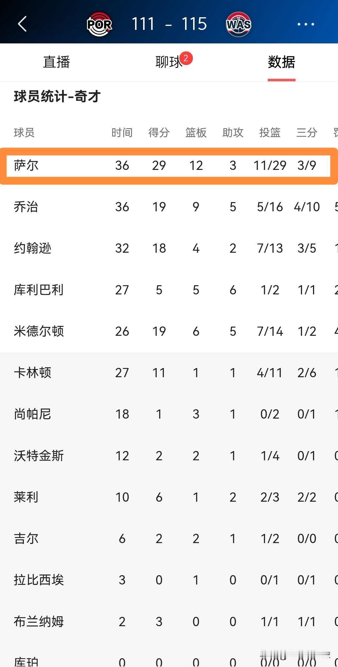奇才超级新星萨尔日后必成大器!在今天奇才主场以115:111击败开拓者的比赛中,萨尔在攻防两端都打出了极其出色的表现,他在首发出战的36分钟里,投篮29中11,其中三分球9中3、罚球5中4砍下29分,外加12篮板3助攻2抢断6盖帽,他的场上正负值为+16。 毫不夸张的说,以萨尔在本赛季的表现来看,萨尔证明了自己是一名极具天赋且攻防兼备的内线,我相信有朝一日萨尔必成大器。