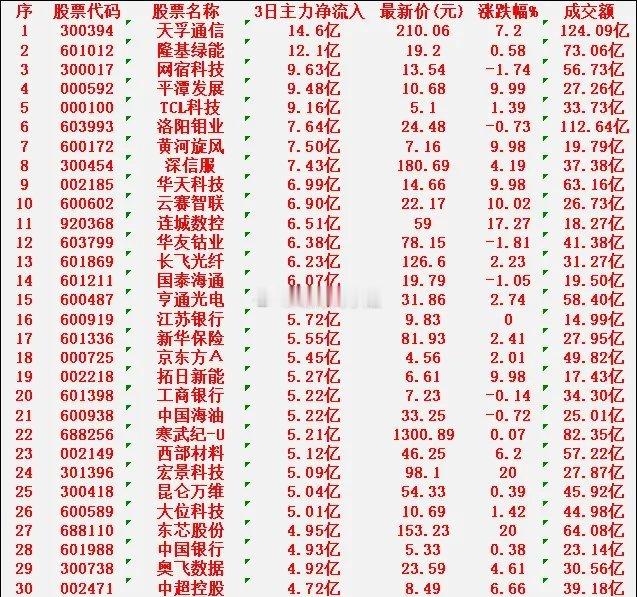 1月28日,前3天主力大幅买入的30名单!天孚通信icon:净流入 14.6亿元,最新价 210.06元隆基绿能icon:净流入 12.1亿元,最新价 19.20元网宿科技icon:净流入 9.63亿元,最新价 13.54元平潭发展:净流入 9.48亿元,最新价 10.68元TCL科技icon:净流入 9.16亿元,最新价 5.10元洛阳钼业:净流入 7.64亿元,最新价 24.48元黄河旋风:净流入 7.50亿元,最新价 7.16元