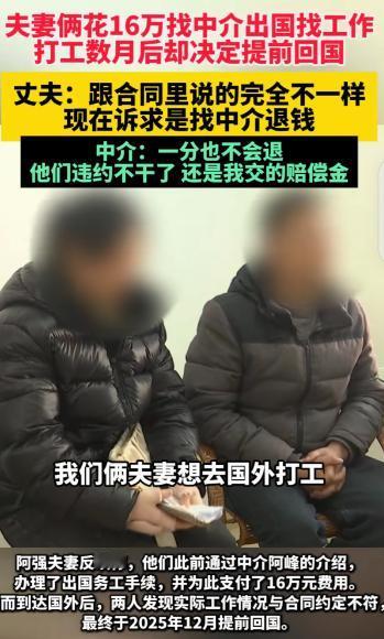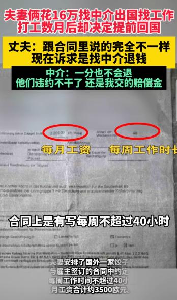 福建三明,一对夫妻花16万中介费,去奥地利打工,两人月工资加起来3500欧元,折合人民币28000多元,每周工作时间不超过40小时,把夫妻俩乐坏了,觉得发家致富指日可待。可到了奥地利,他们傻眼了,每天早晨8点干活,干到半夜12点,夫妻俩干了几个月就撤了,要求中介退钱,中介:一分也不会退,他们违约不干了,还是我交的7200欧元的违约金。 福建三明阿强夫妻(化名)到现在都想不通,自己掏了16万中介费,在奥地利饺子作坊干了7个月苦役,最后不仅一分钱没赚到,还被中介阿峰拿着伪造单据威胁。 要么认了一笔“违约金”,要么就曝光他们非法务工的事。 这场骗局里,藏着比超长劳作更致命的隐秘陷阱,也是很多底层务工者最容易踩的坑。 夫妻俩四十出头,在老家靠种田、打零工糊口,孩子要上大学,学费和生活费压得两人喘不过气。 同村有人说去欧洲务工3年能攒几十万,夫妻俩动了心,经朋友牵线认识了中介阿峰。 阿峰嘴甜,一开始就摸准他们的心思,抛出单人月薪1700欧元的诱饵,见阿强想带妻子同去,立刻改口“夫妻合并发薪3500欧元,折合人民币两万八,比单独干赚得多”,还拍着胸脯保证包吃包住、每周工作不超40小时,连医疗保障都承诺得明明白白。 可等夫妻俩点头后,阿峰就开始玩起了套路。 他明确总中介费16万,转头又以“签证费、材料费、接机费”等名义拆分收取,还要求先付80%才能办手续。 夫妻俩掏空所有积蓄,又挨家挨户找亲戚借钱,放下身段求了一圈,才凑够钱交给阿峰。 2025年5月,他们拿着阿峰办的签证飞往奥地利,落地后才发现,所谓的“饺子馆”,只是个小型地下作坊,而阿峰给他们办的并非合法工作签,仅能短期停留,到期后靠非法渠道续期。 这也是他们不敢反抗的核心原因——语言不通,签证不符合务工资质,一旦被当地移民局查处,不仅会被遣返,还会被限制入境。 作坊老板吃透了这一点,把压榨做到了极致:阿强每天清晨7点到岗,打包、装车、打扫卫生连轴转到晚上七八点,每天工作12小时以上,妻子在作坊辅助工作每日长达16小时,每周工作时长远超约定的40小时,却没有一分加班费,连应得的工资都被雇主拖欠。 夫妻俩多次联系阿峰反映,对方要么以“签证续期要加钱”威胁,要么干脆失联。 直到2025年12月,签证再次到期,夫妻俩怕被查处,只能狼狈收拾行李回国,满心指望能要回中介费,却撞上了阿峰的“反杀”。 阿峰不仅拒绝退钱,还拿出一张伪造的雇主单据,声称他们擅自离职,自己替二人垫付了违约金,甚至扬言说要把他们非法务工的事捅到村里。 这时夫妻俩才发现,当初签的“合同”竟是空白的,没有任何关于工时、薪资、违约条款的约定,连阿峰的中介公司都没在工商部门注册,之前对接全程靠微信,他们连对方的真实住址都不知道。 私下协商无果,夫妻俩求助了帮帮团栏目,司法所介入后才知道,查询正规中介资质要通过商务部“对外劳务合作企业名录”,可他们当初根本不知道这个渠道,早已错过核查时机。 更无奈的是,他们没有留存任何打卡记录、工作凭证,连和阿峰的聊天记录都因换手机丢失,调解只能因证据缺失暂时中止,维权之路彻底走进死胡同。 类似的骗局并非个例。 此前有中国公民花15万中介费赴德国中餐厅务工,中介同样用不符合务工资质的签证蒙混过关,落地后每天工作14小时,护照还被雇主扣下,辞职后中介以“违约”拒退费,最后只能靠中国驻德领事馆协助才拿回护照,中介费却石沉大海。 按照奥地利法律,非法雇佣外籍劳工可处雇主每人1000至5000欧元罚款,情节严重者还会面临监禁,务工者也会被遣返,但受害者往往因签证问题,连举报的勇气都没有。 如今,16万中介费,再加上七个月的苦役和一身病痛,让阿强夫妻俩背负沉重外债,连亲戚都不敢见。 这场破碎的淘金梦,不仅是被“高薪”谎言欺骗,更暴露了底层务工者对海外务工规则的无知。 正规对外劳务中介必须在商务部备案、能提供合法工作签,合同需明确工时、薪资等核心条款,这些基础常识,成了他们用血泪换来的教训。 如果各位看官老爷们已经选择阅读了此文,麻烦您点一下关注,既方便您进行讨论和分享,又能带来不一样的参与感,感谢各位看官老爷们的支持!
