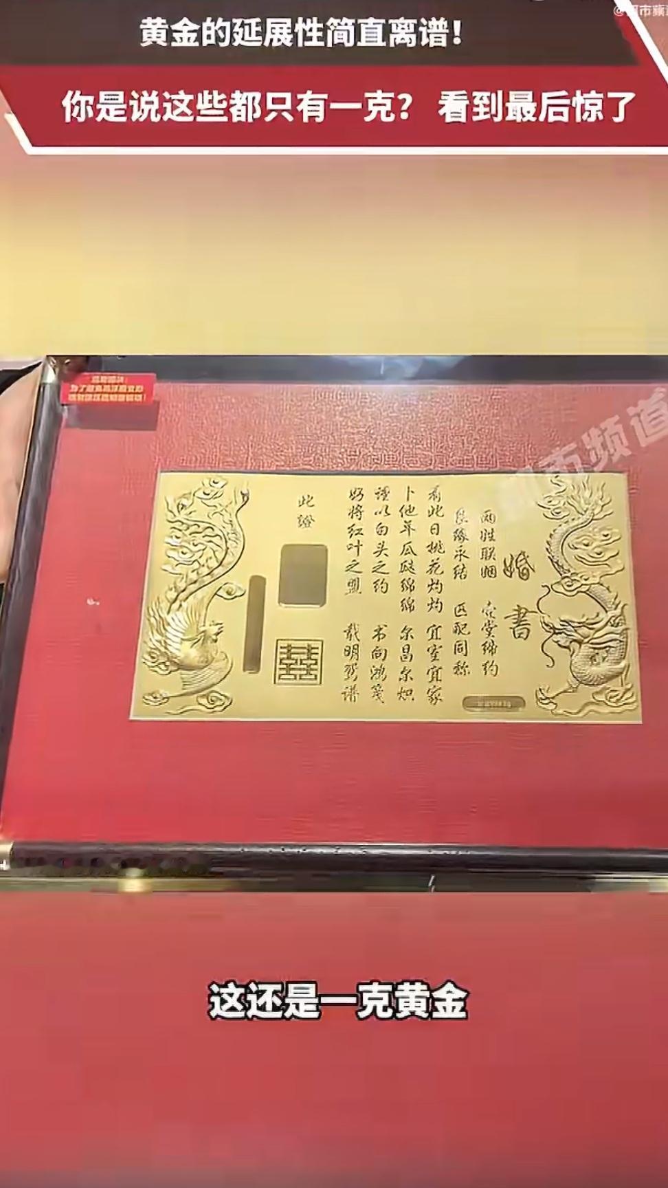 黄金圈出了件新鲜事——有人用1克黄金打出了整张婚书!这事儿听着像变魔术,其实背后藏着黄金的“超能力”和年轻人的新脑洞,先说说这婚书啥样,有位郑州的打金店老板娘晒过成品:巴掌大的金箔上刻着新人姓名、结婚日期,四周镶着镂空花纹,灯光一照金灿灿的,跟艺术品似的。更绝的是,这么精致的东西,用的黄金才1克重,价格也就千把块,但仪式感直接拉满,有位小伙子攒了5克小金豆,让师傅打成5.20克的婚书,寓意“我爱你”,女朋友收到后乐得直发朋友圈。 这背后的秘密全在黄金的“延展性”上。黄金是出了名的“软金属”,1克纯金能拉成3公里长的细丝,或者压成0.0001毫米厚的金箔。实验室里1克黄金甚至能铺满50平方米,相当于半个篮球场那么大!不过实际做婚书没那么夸张,打金师傅会用传统工艺把黄金反复捶打、碾压,最后做成0.03毫米厚的金箔,既结实又透光,阳光一照能看见字迹透出来。为啥年轻人突然迷上这种“小克重浪漫”?说白了是消费观念变了,以前结婚讲究“三金一钻”,动辄上万块,现在小情侣更愿意把钱花在“情绪价值”上,1克黄金婚书就是个典型例子:价格亲民,买起来没压力;造型独特,能刻专属誓言;还能当传家宝收着,比买现成的金饰更有纪念意义。郑州那家打金店老板娘说,最近一个月卖出去七八百个1克重的“金饼”,上面印着“公主请发财”“不画饼只给真饼”这类网络梗,年轻人买去当礼物,既搞笑又走心。 不过也有人质疑:1克黄金婚书会不会太薄?其实师傅们早有办法,他们会用两层金箔夹着极薄的衬纸,既保持透光感又不易破损,要是想要更厚的,加点金料就能做成“520克”“1314克”的版本,不过那价格就上去了。普通小情侣更爱1克这种“轻量级”,毕竟爱情的分量从来不是用克数衡量的。 这事儿还带火了一波“黄金DIY”。有人用1克黄金打戒指,有人打吊坠,甚至有人把金箔压成花瓣,做成永不凋谢的“黄金玫瑰”。打金师傅们也跟着升级设备,现在只要客户提供图案,电脑就能精准控制雕刻深度,连龙凤纹、祥云纹这些传统元素都能完美还原,说到底,1克黄金婚书火的不是黄金本身,而是年轻人对婚姻的新理解——不再追求“贵”和“大”,而是要“独一无二”和“真心实意”。就像那位攒金豆打婚书的小伙子说的:“钱多钱少不重要,重要的是我想让你知道,我连‘我爱你’都要用最特别的方式说。”结婚黄金 黄金婚书 1克黄金竟能打造一张完整黄金婚书 事件来源:都市频道