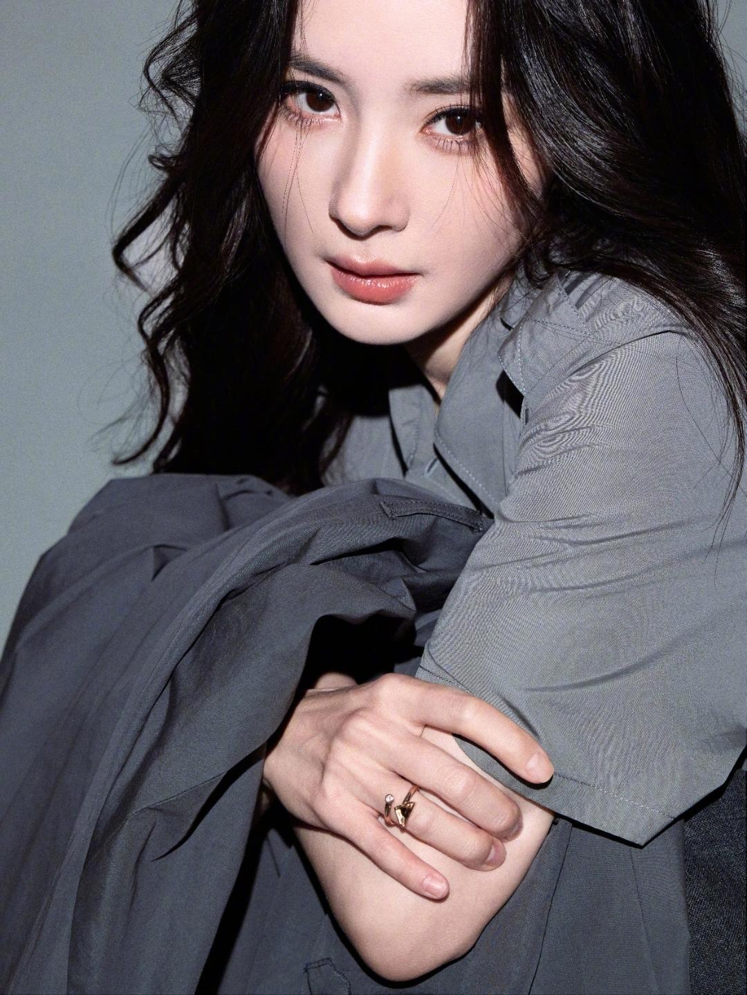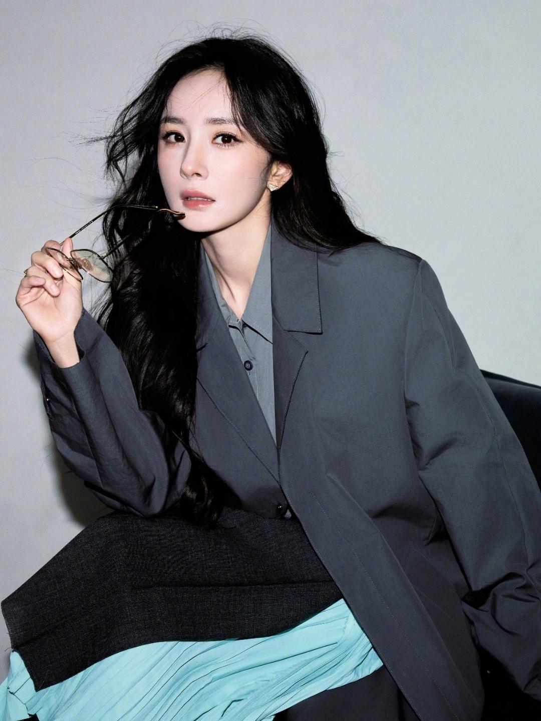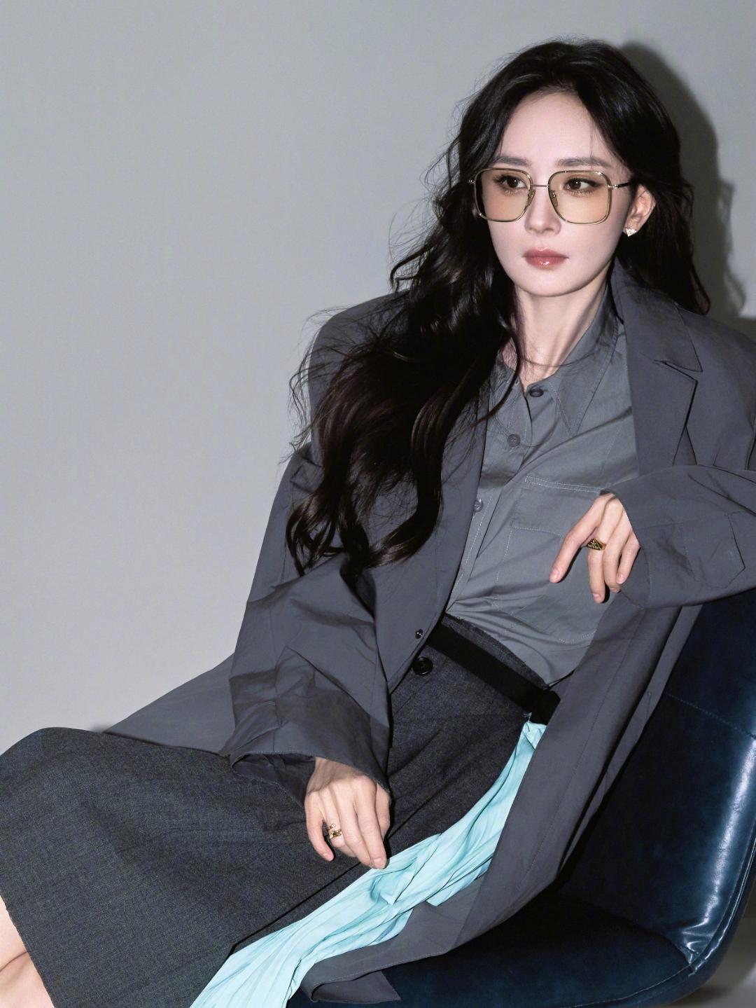 宽松廓形的深灰西装外套搭配浅灰衬衫,层次感拉满,深灰半裙里的浅蓝褶皱暗藏小心机,低调又吸睛。金色边框眼镜点缀其间,整套造型松弛又显贵,完美诠释了“慵懒时髦感”