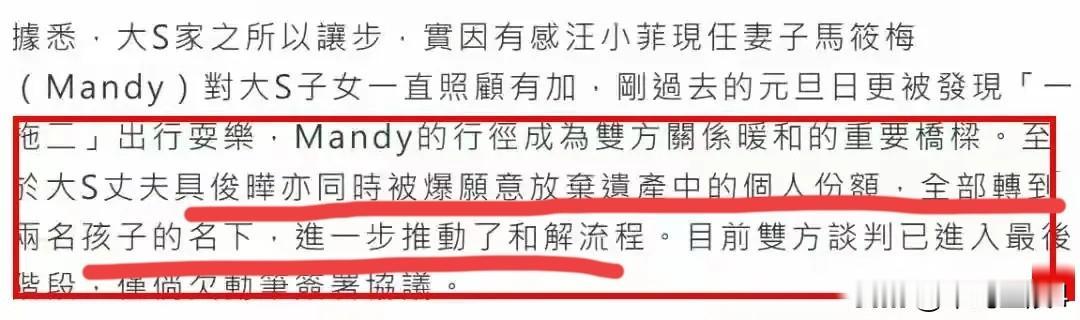 具俊烨放弃继承大S的遗产,全部把个人所得部分转给孩子名下,真是明智的选择,不仅摆脱了软饭男标签,还立了一波好人人设。 其原因有两个,说实话,具俊烨别无他路,如果继承遗产,首先要缴纳千万遗产税,转到孩子名下,那么就要由监护人汪小菲负责了,如果具俊烨有能力,也不会拖这么久了,论财力还得汪小菲。 其二,据悉大S豪宅就抵押了三次,除去负债,能继承多少还是未知,如果没多少,那具俊烨真没必要继承,还不如做个顺水人情,立个好人设。 为利益撕的不可开交,现在又突然和解,应该都权衡过利弊吧![呲牙]