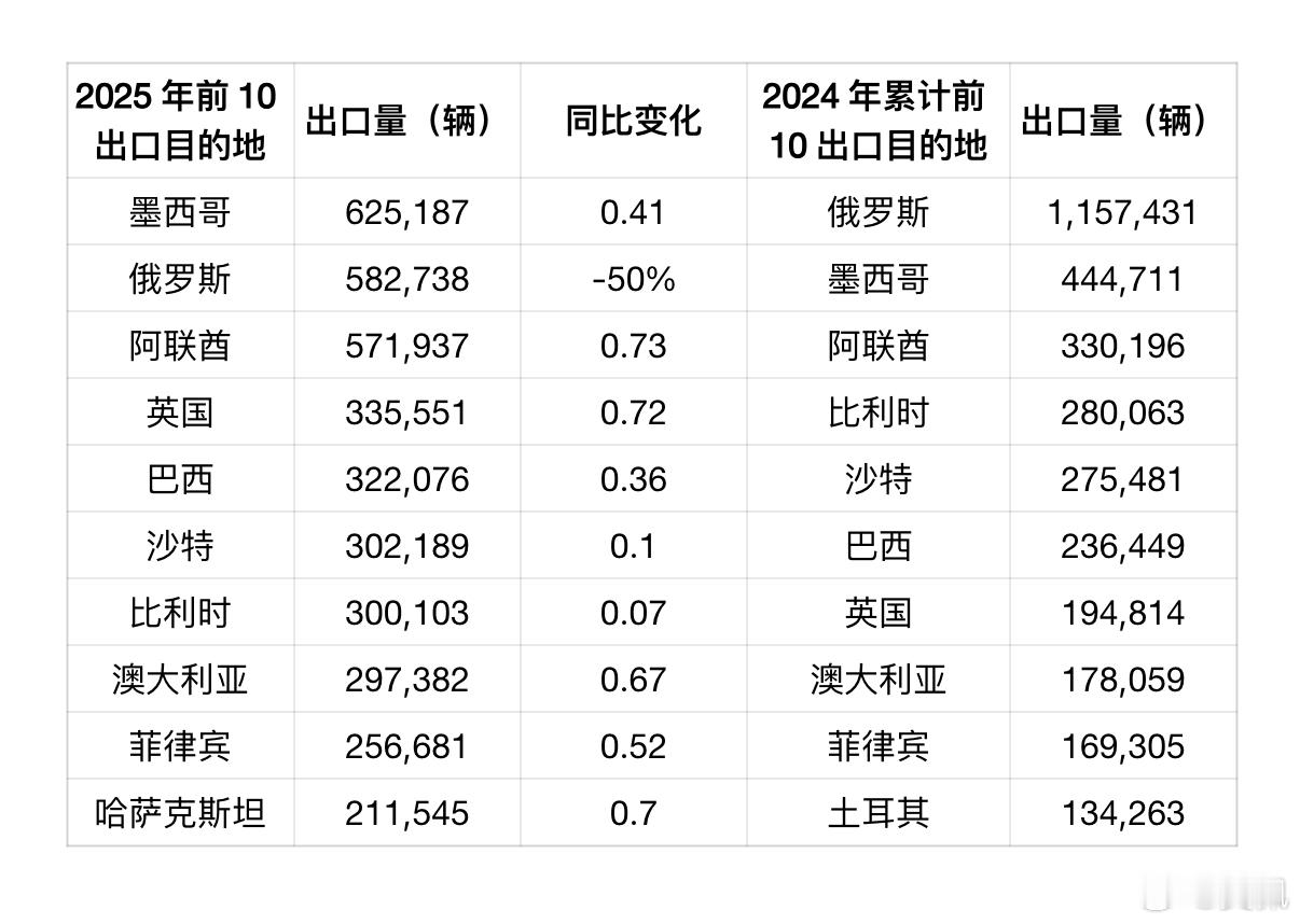 中国汽车出口第一目的国易主 看表格,仅一年时间,出口国及同比数据都发生了很大的变化,聊几点吧:1、俄罗斯锐减50%,一是政策重压(俄大幅上调进口汽车关税和保费税),二是经济低迷,再一个是他们有技术认证的壁垒,他们要求所有进口车辆必须通过本土实验室的 OTTC 认证,禁止使用境外实验室结果,这个政策大幅延长了俄国以外车企的准入周期。2、墨西哥怎么“默默”排到第一了?其实是它的战略区位和政策红利成为了中国汽车销往北美的最佳 “跳板”: 要知道,在墨西哥生产且满足区域价值含量要求的汽车,是可以零关税出口到美国、加拿大的。于是,中国车企通过 “出口整车到墨西哥→本地组装→转口北美” 的模式,成功规避了美国对中国电动车的高额关税。其次,中国车在墨西哥本土市场也确实有很大的价格优势,像比亚迪、奇瑞等品牌的车型已经占据了墨西哥新车销量的五分之一。(墨西哥全球人口排名第十,妥妥的人口大国)3、阿联酋、英国同比上涨得厉害,其实原因是比较一致的——它们都在大力推动新能源汽车普及。阿联酋辐射到沙特、卡塔尔等国,相当于一个“超级中转站”,在那边,包括比亚迪 Atto 3(即国内元 PLUS)、奇瑞瑞虎 8 Pro、捷途 T2、极石 01 等SUV都非常受欢迎;而英国则是MG4 EV、Jaecoo J7(国内瑞虎7 C-DM)成为了爆款,另外包括比亚迪海豚(Dolphin)、海豹(Seal)等也在那边表现抢眼。用四个字评价中国汽车出口状况,你会是:_____________。大v聊车新能源大牛说
