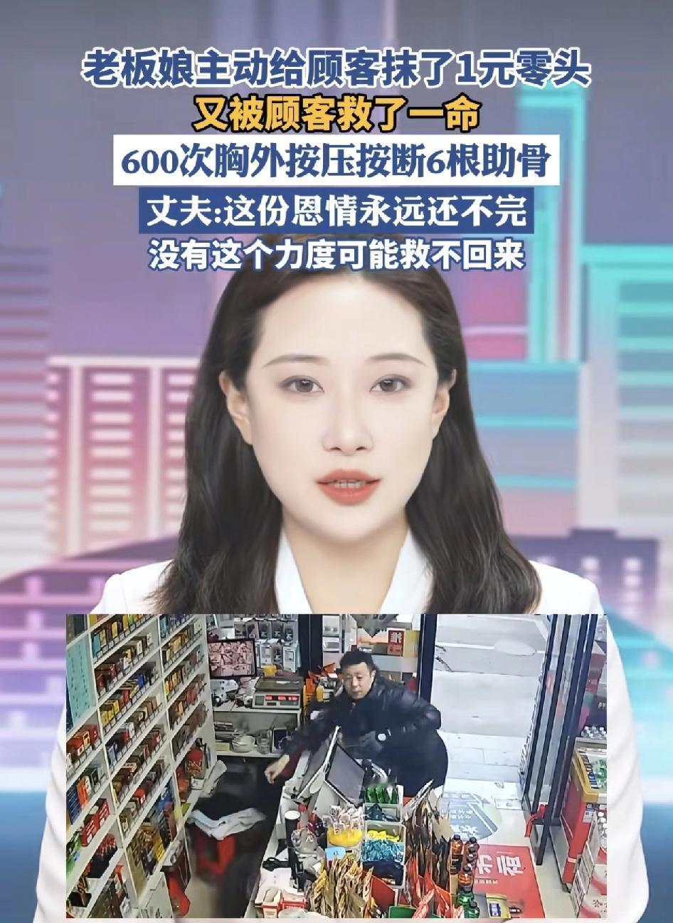 江苏苏州一家小超市内男子购物付钱时,老板娘主动抹去一块钱的零头,因为做人脸人多说了几句话,突然老板娘晕倒在地,男子见状赶紧拨打120在医护人员。隔空指导之下,男子一口气就要心肺复苏按压600多次,并间接用人工呼吸,直到救护人员赶到。老板娘的几根肋骨也被压断了。最终老板娘被救回来,老板娘的丈夫说,正因为有这样的力度,才使得心肺复苏有效果。而这份恩情是永远都还不回去的。