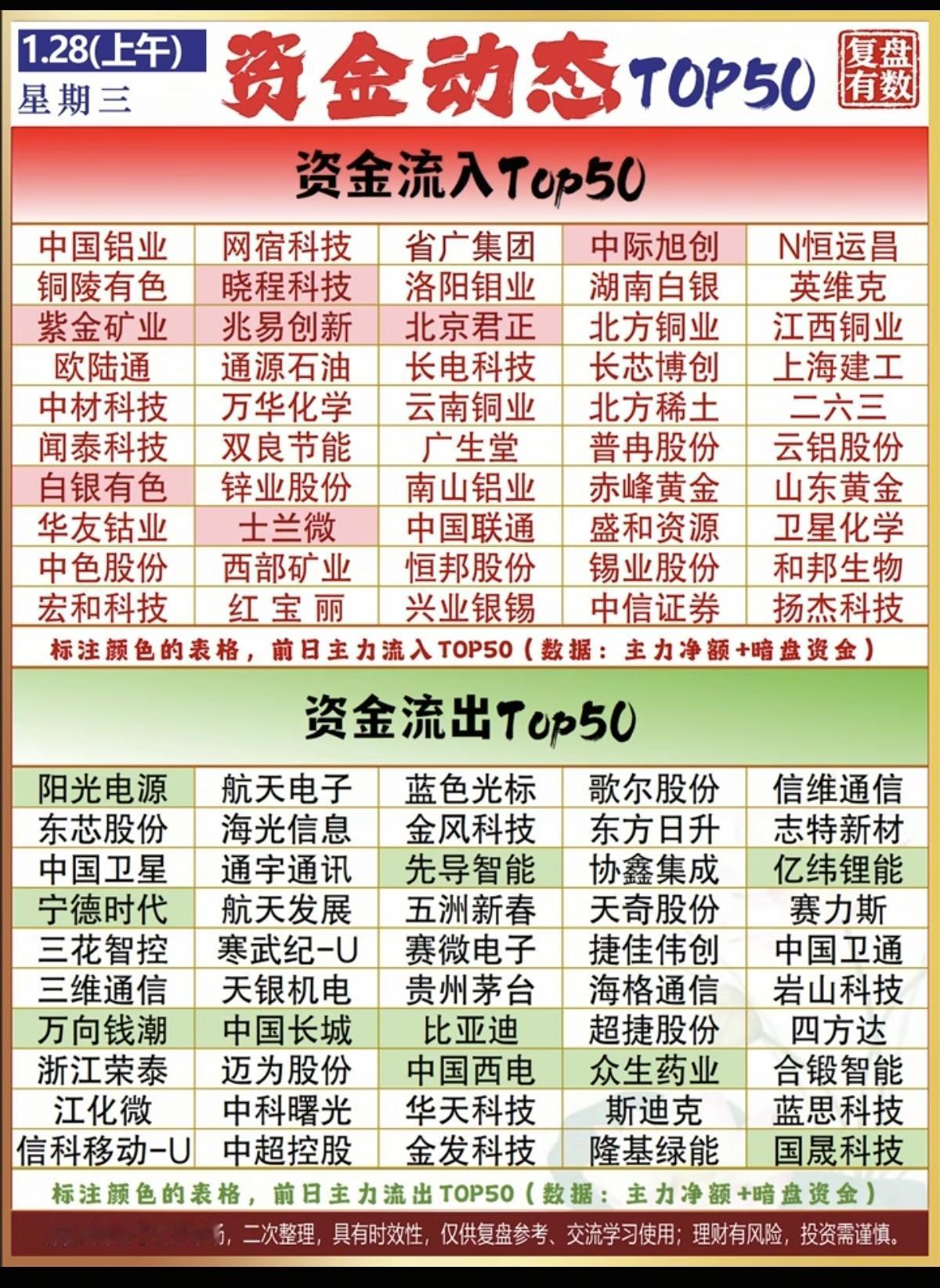 1.28周三 主力大资金 抢筹出逃个股榜! 资金抢筹: 贵金属黄金白银,有色金属,继续强势! 贵金属白银,黄金矿冶炼加工,有色金属,石油,珠宝首饰等。 资金出逃: 光伏设备,航天航空,生物制品,电池相关等资金出逃