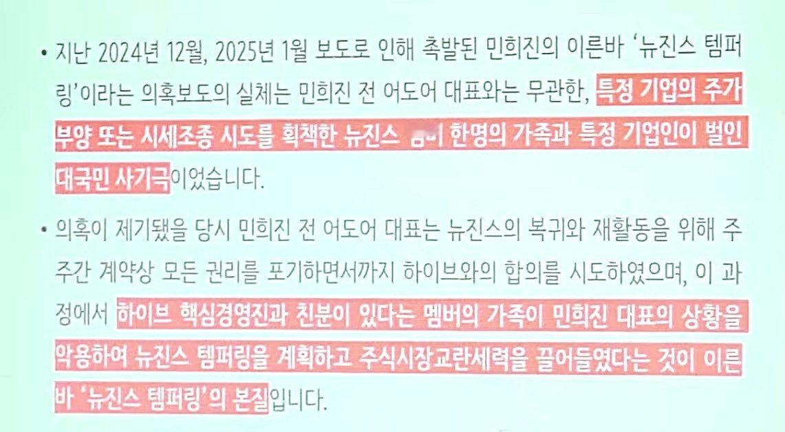 2024年12月和2025年1月媒体报道引发的所谓“NewJeans操纵股价”指控,实际上是一起由NewJeans一名成员的家人和某商人实施的全国性诈骗案。该案与前ADOR首席执行官闵熙珍无关,而是企图人为抬高某特定公司的股价,或进行股价操纵。在这些指控提出之时,前ADOR首席执行官闵熙珍正试图与HYBE达成协议,甚至不惜放弃其在股东协议项下的所有权利,以促成NewJeans的回归和恢复运营。在此过程中,一位与HYBE核心管理层关系密切的成员家族利用闵熙珍的脆弱处境,策划了所谓的“NewJeans操纵案”,并引入了扰乱股市的力量。这才是所谓“NewJeans操纵案”的本质。