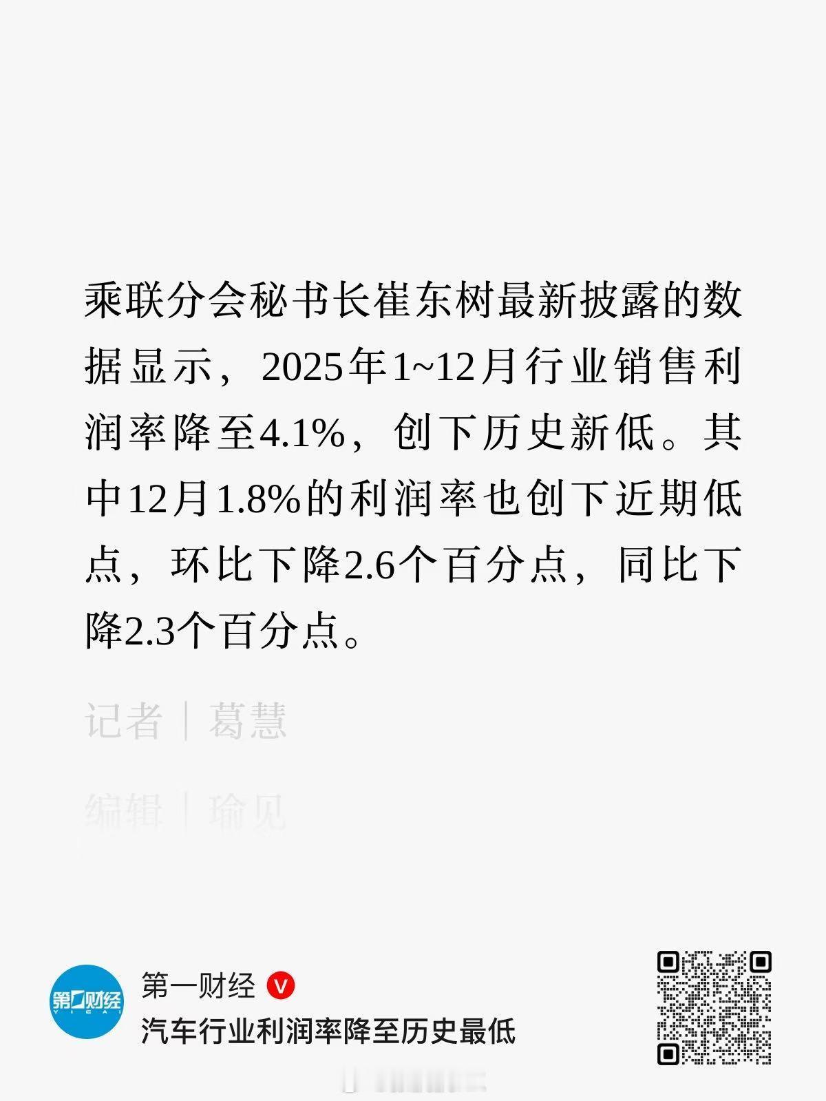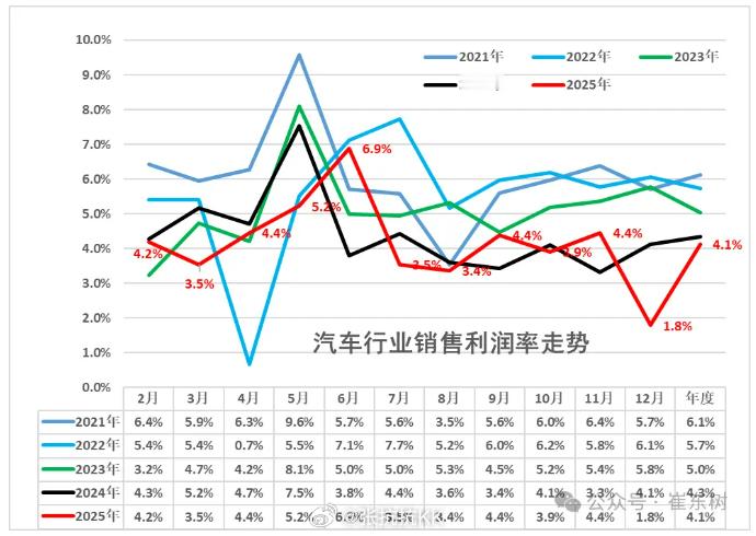 汽车行业利润率多少? 据乘联分会秘书长崔东树:2025年12月1.8%的利润率也创下近期低点,环比下降2.6个百分点,同比下降2.3个百分点。2025年1~12月行业销售利润率降至4.1%,创下历史新低。