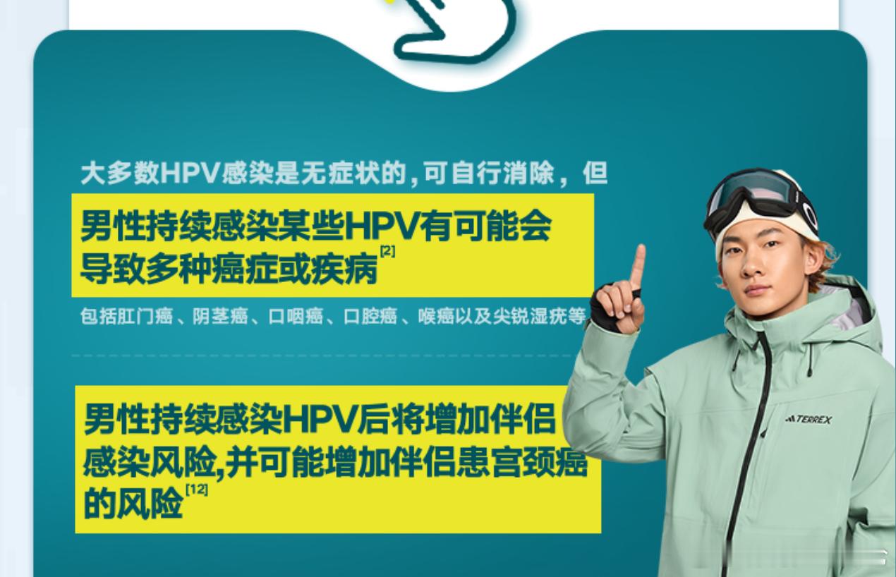 男生可以接种HPV疫苗 和苏翊鸣一起守护健康很多人可能觉得HPV离自己很远,尤其是男性可能觉得这是“女生才需要关心的事”。但就在最近,滑雪运动员苏翊鸣专门为此发声,呼吁男生们也要重视HPV的预防。这可不是随便说说,因为HPV,早已不只是性别议题,而是一个关乎每个人的健康真相。之前新闻有过报道,一个10岁的男孩暑假上了游泳课后,脚底长满了密密麻麻的小疙瘩。医生诊断这是“跖疣”,正是由HPV病毒感染引起的。这表明HPV的传播途径比社会舆论想的更广。它确实主要通过性接触传播,但也能通过皮肤微小的破损处入侵。除了游泳馆,像孩子们赤脚训练的跆拳道班、舞蹈班等运动场合,也存在传播风险。并且有研究显示,全球约有三分之一的男性感染了至少一种生殖器HPV。而男性感染后更难被身体自动清除,也更容易在不知不觉中成为病毒的携带者。HPV的狡猾在于,初期感染往往没有症状,但它的威胁是实实在在的。男性持续感染高危型HPV,可能引发肛门癌、阴茎癌、口咽癌等多种癌症;感染低危型则可能导致尖锐湿疣,治疗过程不便且容易复发。而想要预防HPV,最核心、最有效的一道防线就是考虑接种HPV疫苗。国内外有多项权威医学指南共识推荐9岁及以上男性接种HPV疫苗,低龄人群接种HPV疫苗的效果优于高龄人群,在初次性行为前接种疫苗将最大限度地发挥保护作用。当然除此之外,个人日常生活的防护也相当重要,就像苏翊鸣说的那样,“每一次稳稳落地的背后,都是上场前万全的准备”,守护健康也是一场需要主动出击的长期“备战”。无论是赛道的每一步,还是生活中的每一个健康选择,提前规划、科学防护,都是我们赢得未来的关键。