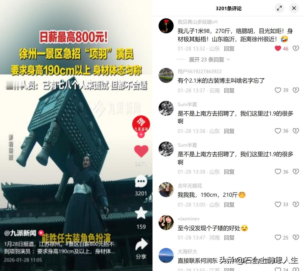 日薪800招不到项羽 徐州一景区急招项羽演员,要求身高190cm以上,面试了七八个人都没合适的。这事一出,大家吵翻,有人起哄去山东招,有人盯着薪资真假不放。 这事细想也有意思。史书里明确说项羽身长八尺余,按秦汉一尺23.1厘米换算,差不多189cm,放在当时是远超常人的巨人,景区卡190cm,也算较真还原历史。大家喊去山东不是瞎扯,数据摆着:山东青年男性平均176+,比徐州的173+确实高出2-3cm,但即便如此,190cm以上的也属人群里的少数。 至于大家吵的薪资争议,800日薪听着诱人,但对身高体态要求这么严苛,也难怪有人怀疑是不是营销噱头。 话说回来,真要演活力拔山兮的楚霸王,光有个子还不够,那股子凛凛霸气,才是最难寻的吧?