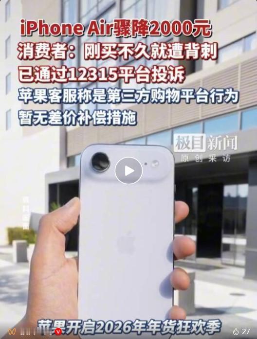 近日,青岛一网友的购机吐槽引发全网热议。该网友称,自己在当地苹果授权店按原价入手iPhone Air,没想到第二天就撞上官方限时降价,直接便宜2000元,叠加国补后差价最高达2500元。更闹心的是,授权店既没有7天无理由退货,也不支持14天无理由政策,手机激活后既退不了货,也没法申请保价,相当于一天之内白白损失2000元,只能吃了哑巴亏。 据权威媒体核实,苹果此次降价活动自1月25日晚间启动,针对iPhone Air机型推出限时优惠,其中256GB版本原价7999元,降价后叠加补贴到手仅5499元,这款上市刚满3个月的新机,创下近期苹果机型降价幅度之最。不少同期原价购机的网友纷纷吐槽“被背刺”,甚至有用户已向12315平台发起投诉,希望能追回差价。 值得注意的是,苹果授权店与官方自营店的售后规则差异明显。两者虽保修服务一致,但官方自营渠道(官网、线下直营店)支持14天无理由退货,即便手机激活也可办理,消费者可通过“退货重买”变相享受价格保障;而授权店多为第三方合作经营,为防范黄牛倒卖,普遍约定“激活后不退不换、无保价服务”。对此,苹果官方客服回应称,目前暂无统一的差价补偿方案,已记录用户相关诉求。 律师明确表示,商家根据市场供需调整价格属于正常经营自主权,并不侵犯消费者权益,但如果此前有明确保价承诺,就必须按约定履约。此次事件也给消费者提了醒:购机前务必分清授权店与官方店的规则差异,提前确认退货、保价条款,留存好相关凭证,避免因信息差蒙受损失。