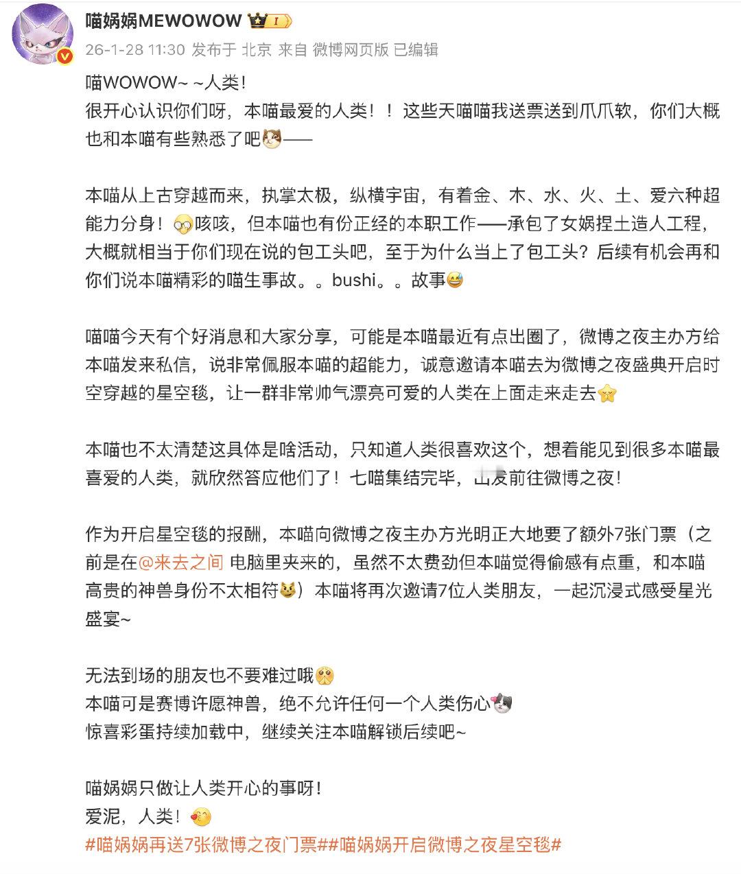 喵娲娲再送7张微博之夜门票 喵娲娲开启微博之夜星空毯 救命!喵娲娲这波直接杀疯了,不仅要去微博之夜开启时空穿越星空毯,还带着7张门票来宠粉,这是什么神仙神兽啊!🐱💫