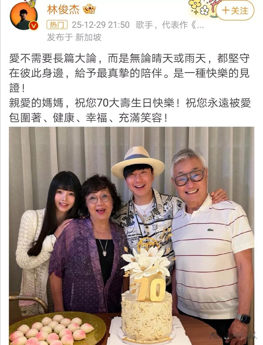 44岁林俊杰终于高调官宣! 12月29日晚上,林俊杰在个人社交账号上发文为妈妈庆祝70岁大寿。 不过,这不是重点,重点是他在文字下方配的那张合照。 照片里一共有四个人,除了林俊杰本人和他的父母外。 其中站在林俊杰妈妈旁边的女生,是让大家最为惊喜的。 这女生就是林俊杰的女朋友。 前不久,林俊杰还陪该女生一起逛街被偶遇,当时就被猜是他的女友。 不过,林俊杰当时并没有正面回应。 没想到,这次借着妈妈70岁大寿,终于是高调官宣了自己的恋情。 而且,能看得出来,林俊杰应该早就把女友带去见过父母了。 他们四个人的合照,个个都笑的很灿烂,尤其是林父林母,喜悦之情溢于言表。 据悉,林俊杰的女友是2001年出生,两人相差20岁。 看女生的正面照,长相很甜美温柔,合照的时候,女生贴着林俊杰的妈妈站,一看他们应该相处的不错。 如今,44岁的林俊杰,父母都健康的陪伴在自己的身边,现在也有了女朋友。 祝福他,也期待他早日传来喜讯。