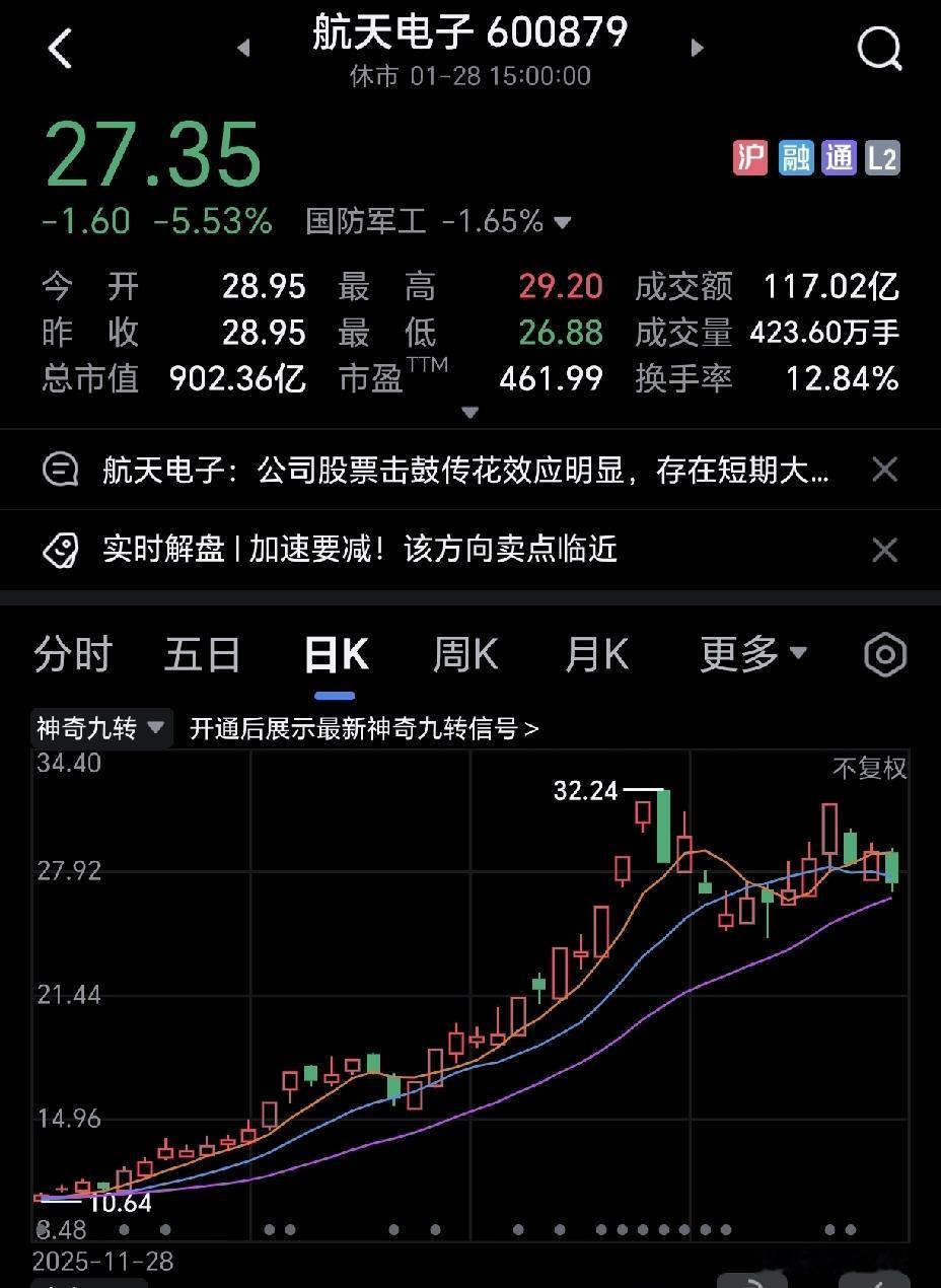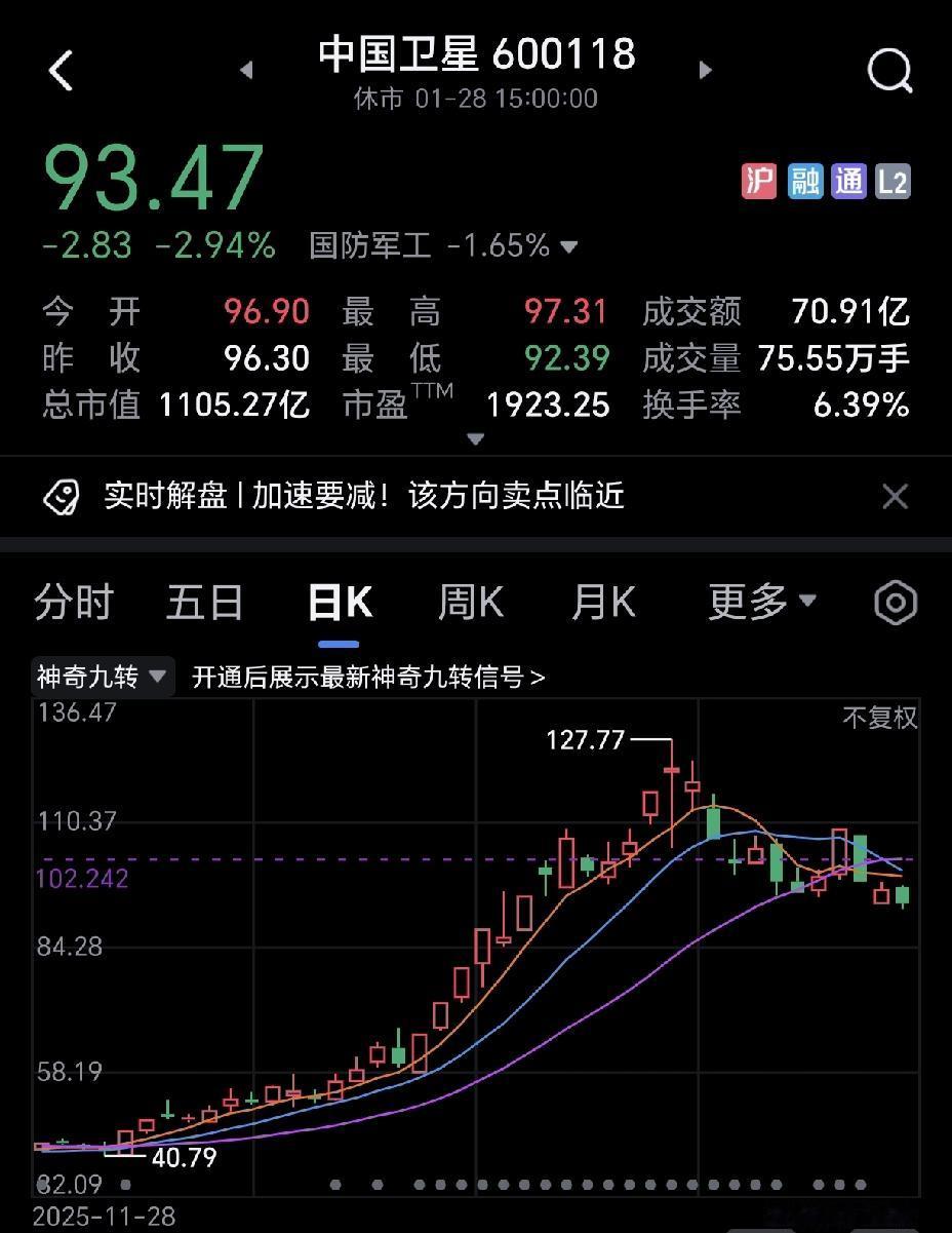 现在的股市,基本上达到了管理层的预期,航天军工熄火了,大把的资金从这个板块里流出,大概率是流入有色金属了。 今天股市前五个流出板块是国防军工、光伏设备、汽车、电池和消费电子。 大家有没有发现,这些板块都是前期非常热的,股价都大涨了一波。 这些板块正式进入调整期,调整多久,没人知道,反正一句话,前期涨幅非常大的个股,最好不要碰。 作为航天的龙头,航天电子跑了12个亿,中国卫星跑了8个亿,也意味着航天板块正式熄火了。航空航天板块 军工股行情 A股航天板块 A股军工板块 航天军工指数 军工行业分析