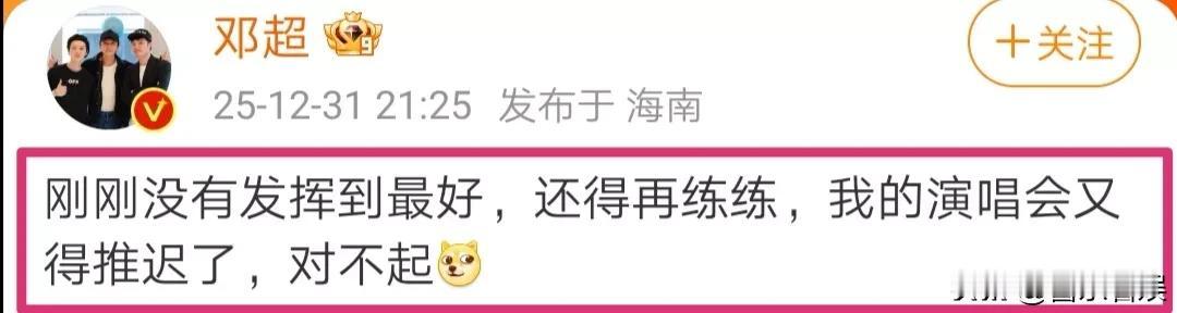 邓超发文道歉! 12月31日晚上9点半,邓超突然在个人社交账号上发文道歉。 没想到,网友们一看后,瞬间喊话:超哥,你都燃爆热搜了,别谦虚了歌王。 原来,邓超是为他今晚的跨年舞台表演而道歉的。 他说:“没有发挥到最好,还得再练练,我的演唱会又得推迟了,对不起!” 今晚邓超在湖南台的跨年晚会上,他自己一个人演唱了三首歌,分别是《超级英雄》、《饿狼传说》、《音浪》。 表演一开始,邓超是吊着威亚从天而降,直接拉满整个现场的氛围。 不仅如此,作为演员出身的他,全程演唱的三首歌,整个人的台风和表现都不输于歌手。 就像湖南卫视发文说的:邓超一个人就是一支队伍! 所以,超哥这出道歉,还是太谦虚啦!